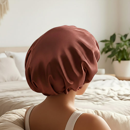 Bonnet de Nuit en Satin Ajustable Marron Chocolat avec Doublure