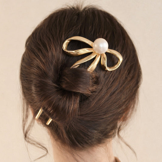 Épingle à Chignon Dorée Ruban Douceur en Nœud avec Perle