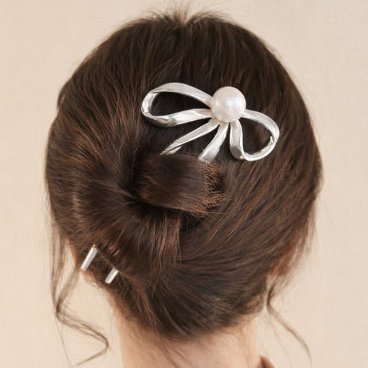 Épingle à Chignon Argentée Ruban Douceur en Nœud avec Perle