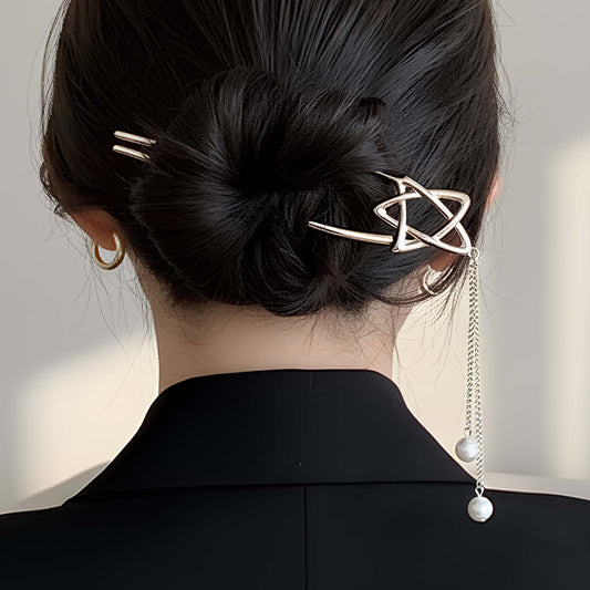 Épingle à Chignon Argentée Polaris Étoile avec Chaînes Perlées
