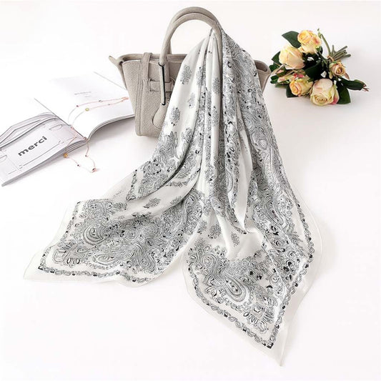 Foulard carré toucher soie Couture Paisley Ivoire satiné 70x70cm