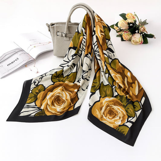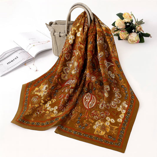 Foulard carré toucher soie Khaki Floral 70x70cm