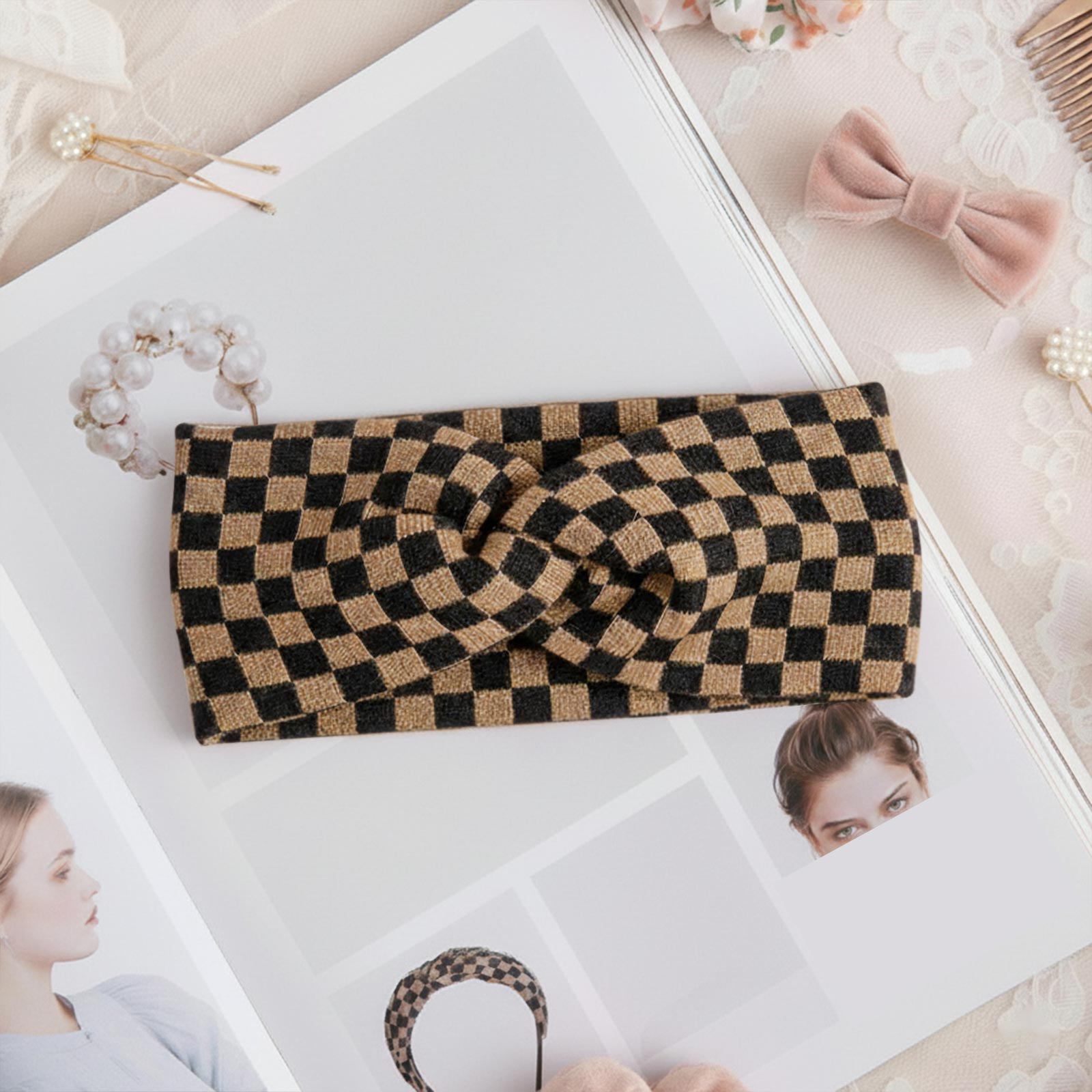 Bandeau Croisé Wendy en Maille Jacquard à Carreaux Marron