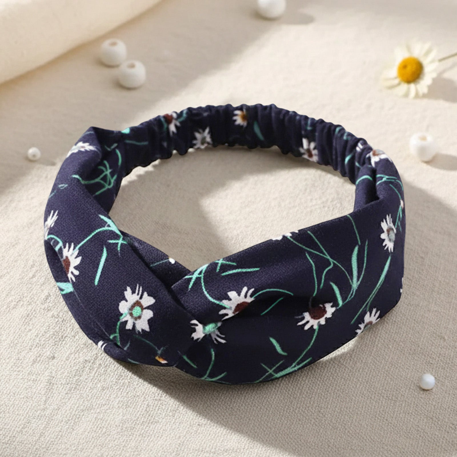 Bandeau Torsadé en Satin Fleuri Lindsay Bleu Nuit