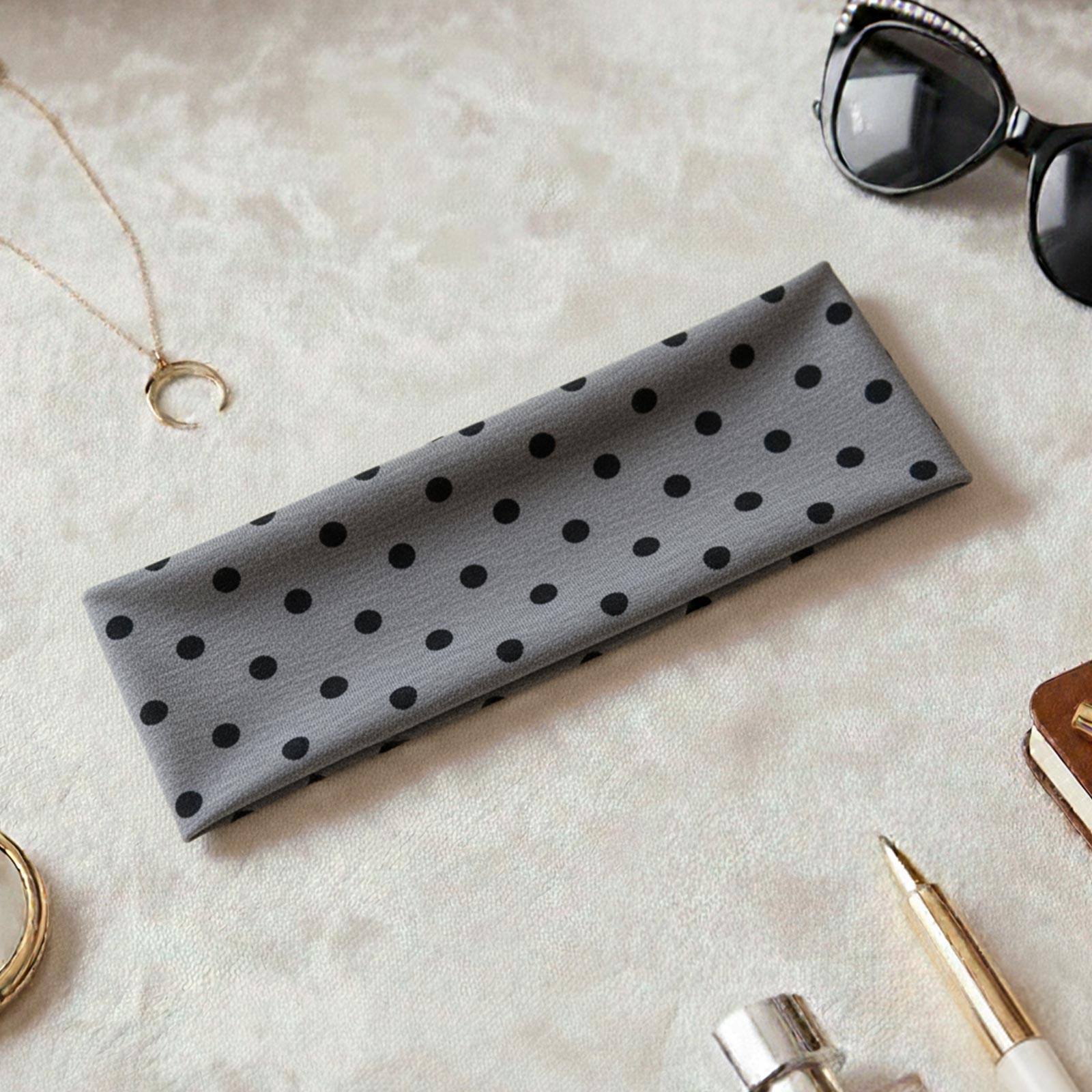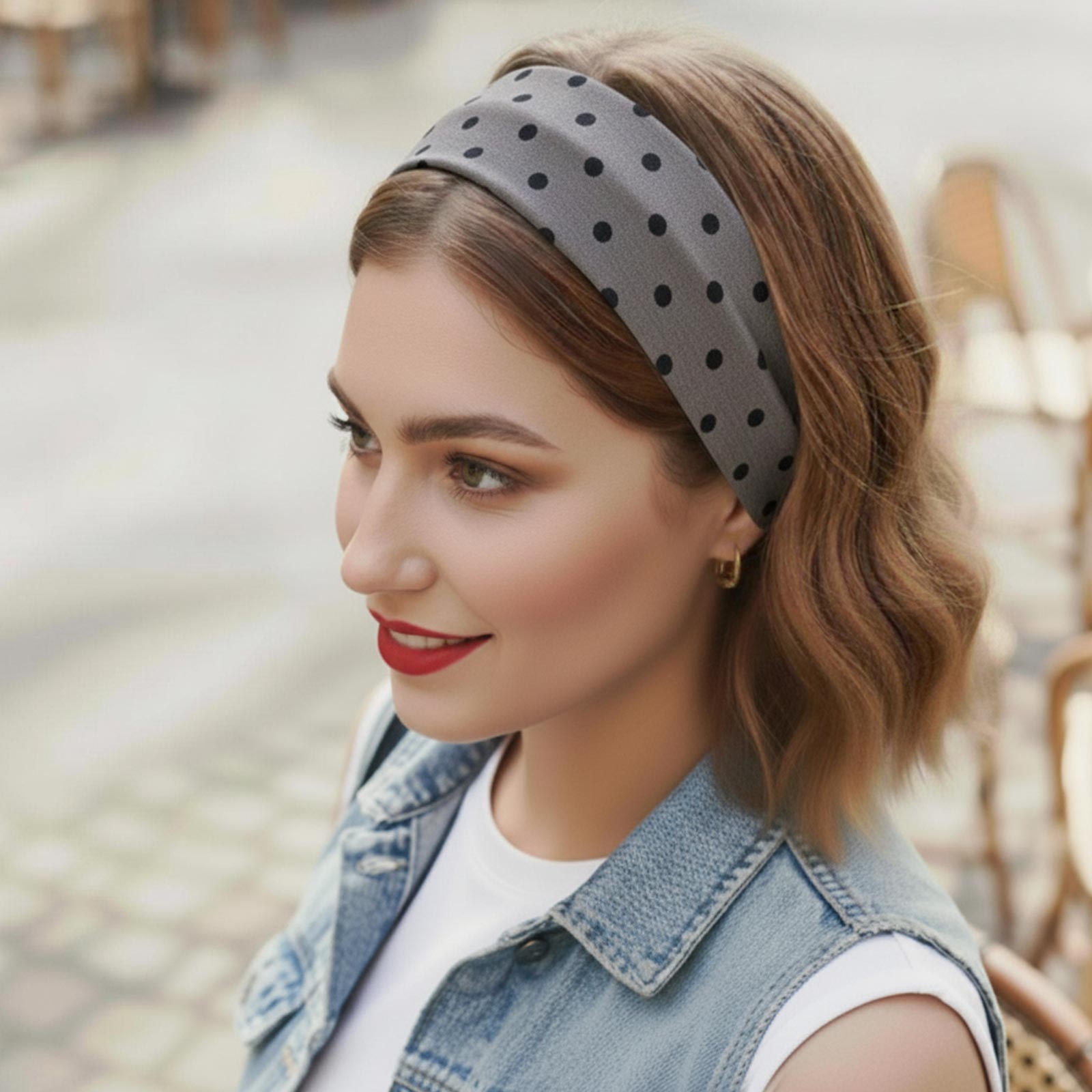 Le bandeau Julia gris associe la modernité d’une teinte neutre à l’intemporalité du pois. Résultat : un accessoire polyvalent, à la fois sobre et plein de caractère, qui s’intègre facilement à toutes les coiffures.