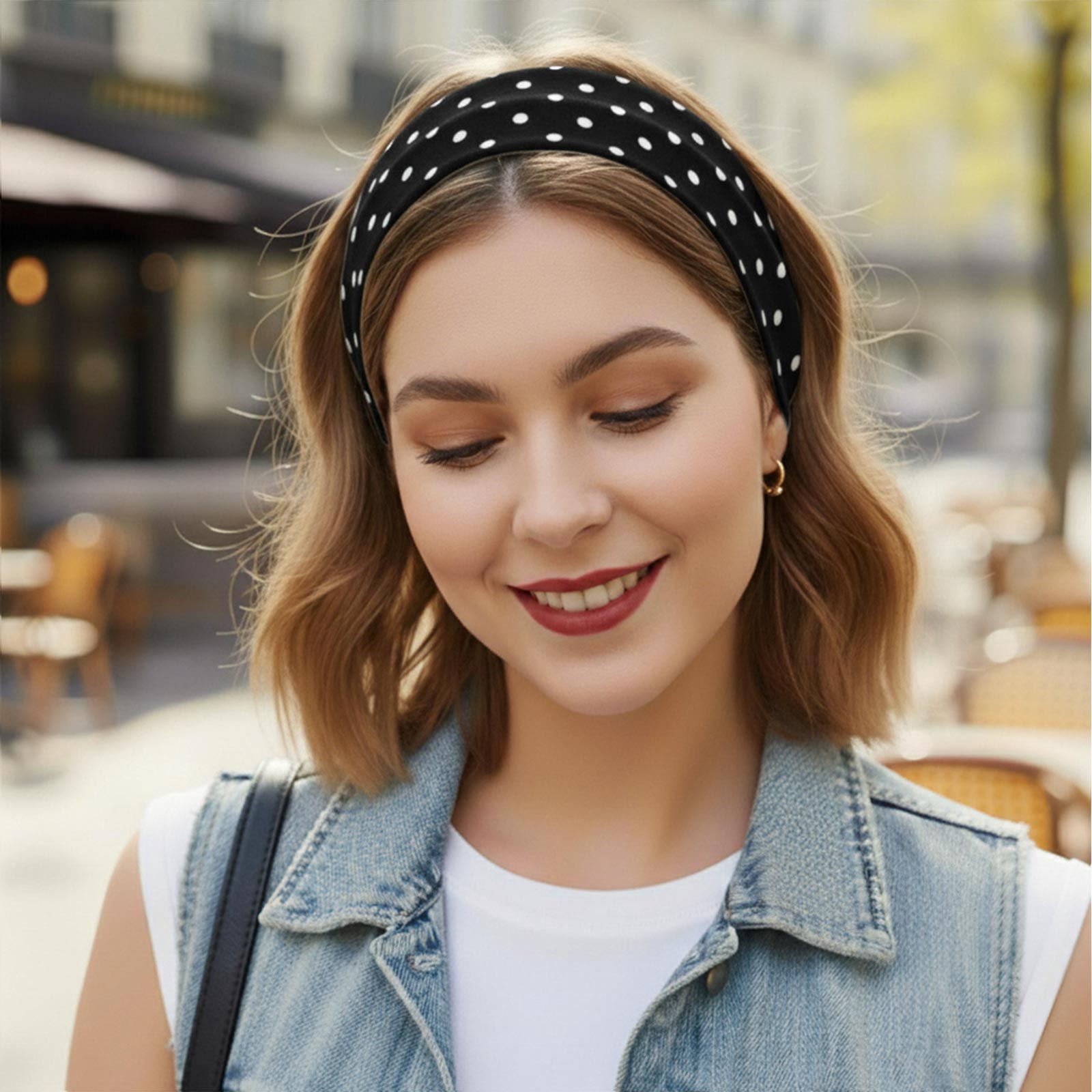 Sobriété et élégance définissent le bandeau Julia noir à pois. Facile à intégrer dans toutes les tenues, il habille la coiffure en quelques secondes et apporte une touche graphique intemporelle.