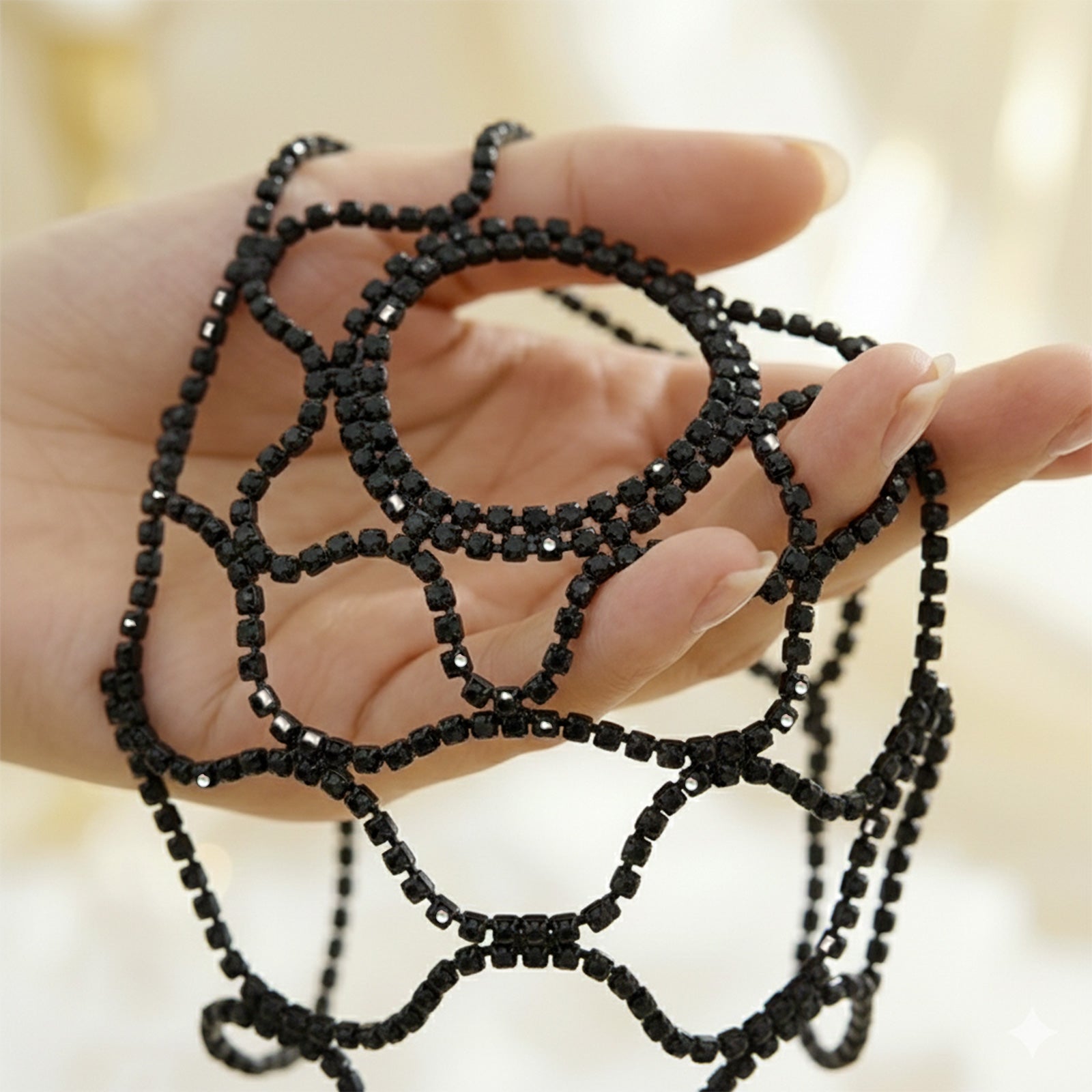 Bijou de Tête Chaîne Noire Type Rosette Florale en Strass