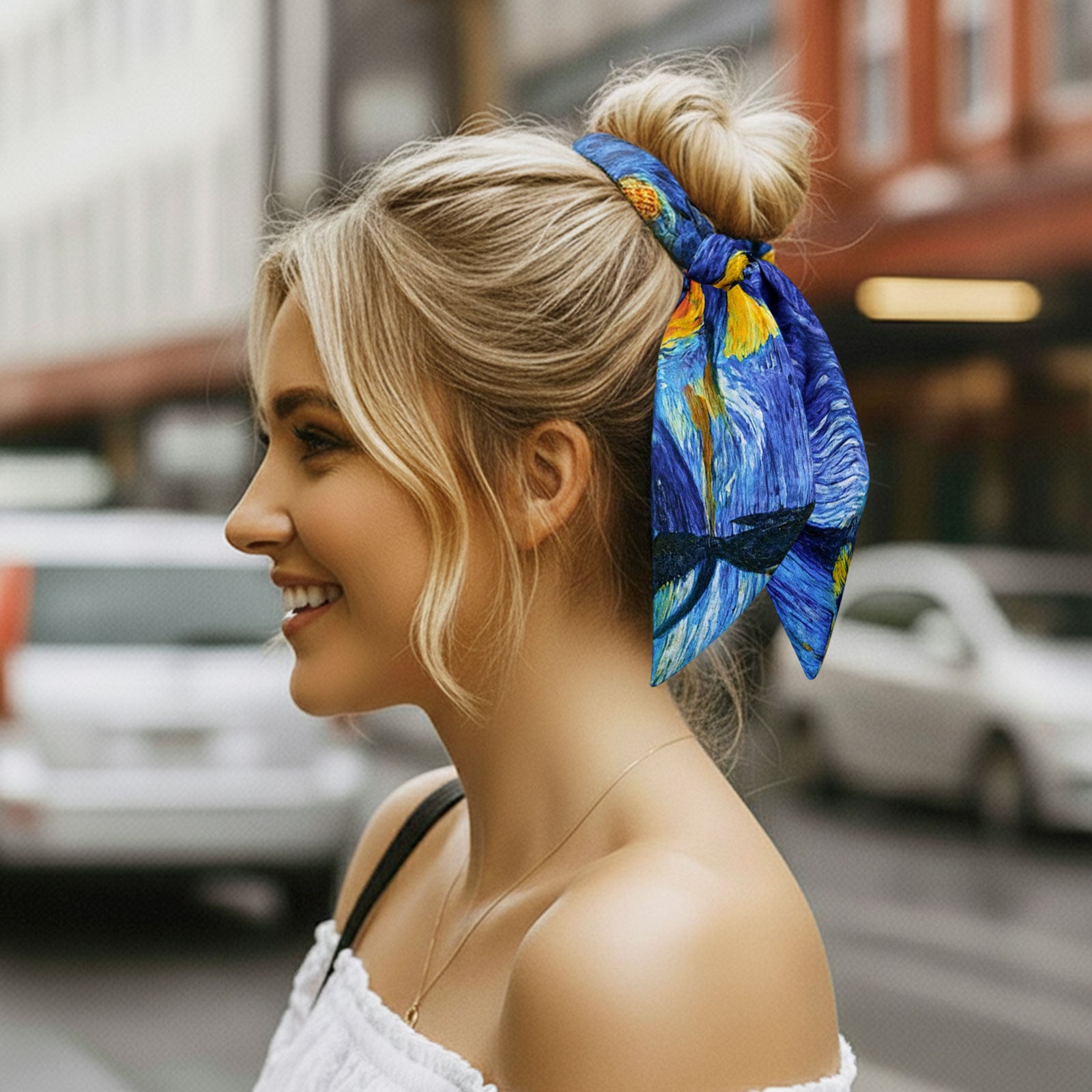 Inspiré des ciels profonds et tourbillonnants, le Chouchou Foulard Nyméria Imprimé Nuit Étoilée attire le regard avec son imprimé artistique et ses reflets bleus intenses. Son tissu fluide glisse délicatement dans les cheveux et illumine les coiffures d’une note poétique.