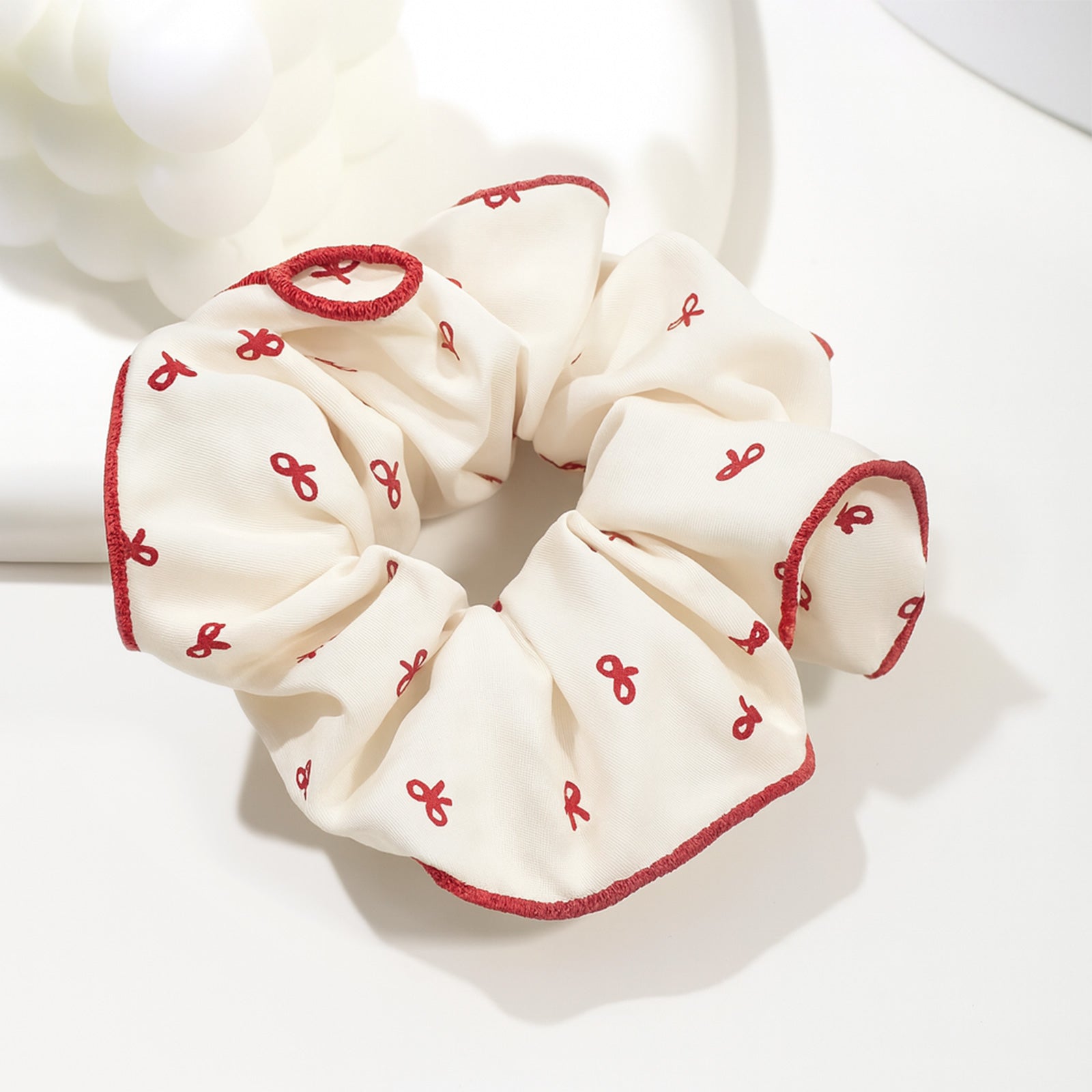 Apportez une touche raffinée à vos coiffures avec ce chouchou en tissu blanc décoré de motifs nœuds rouges. Son design élégant et discret s’adapte à tous les styles, du look décontracté au plus sophistiqué.