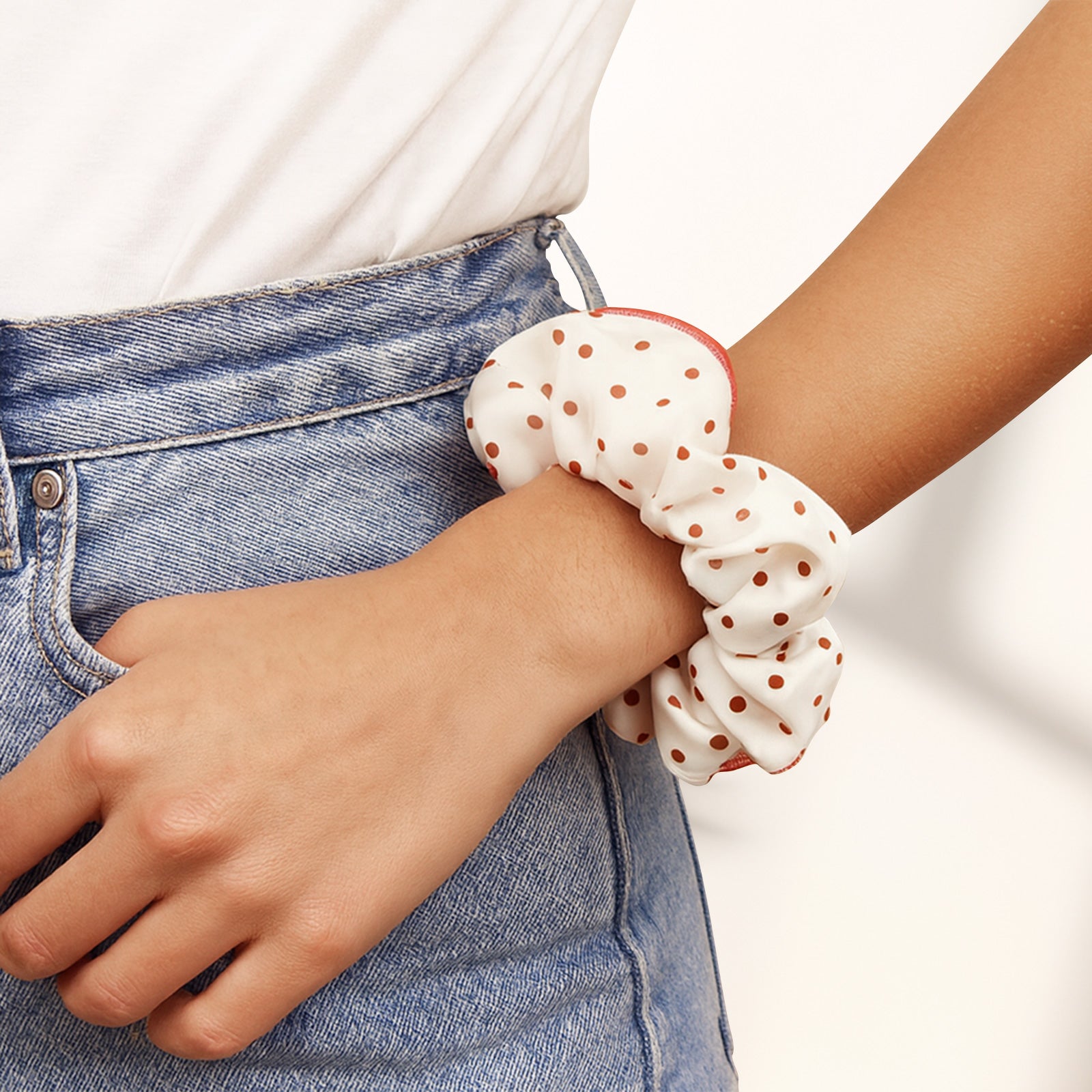 Ce chouchou en tissu blanc à pois rouges est l’accessoire parfait pour un look rétro et tendance. Léger et agréable à porter, il maintient vos coiffures sans abîmer vos cheveux.