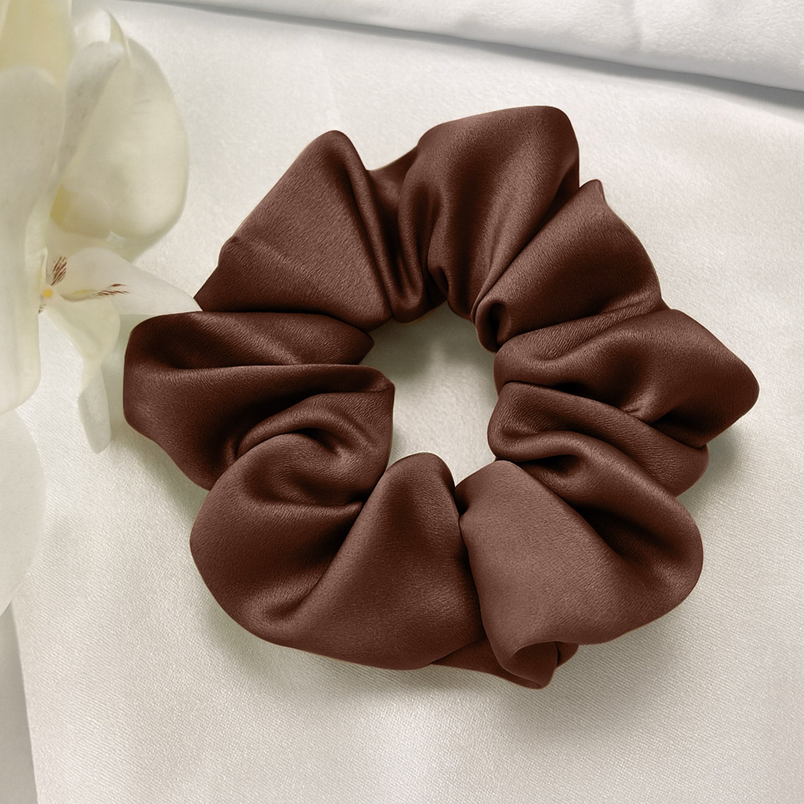 Une présence douce et enveloppante. Le Chouchou XXL Maeve, dans une teinte marron aux reflets noisette, offre une texture soyeuse qui glisse sans accrocher, préservant la fibre capillaire avec délicatesse.