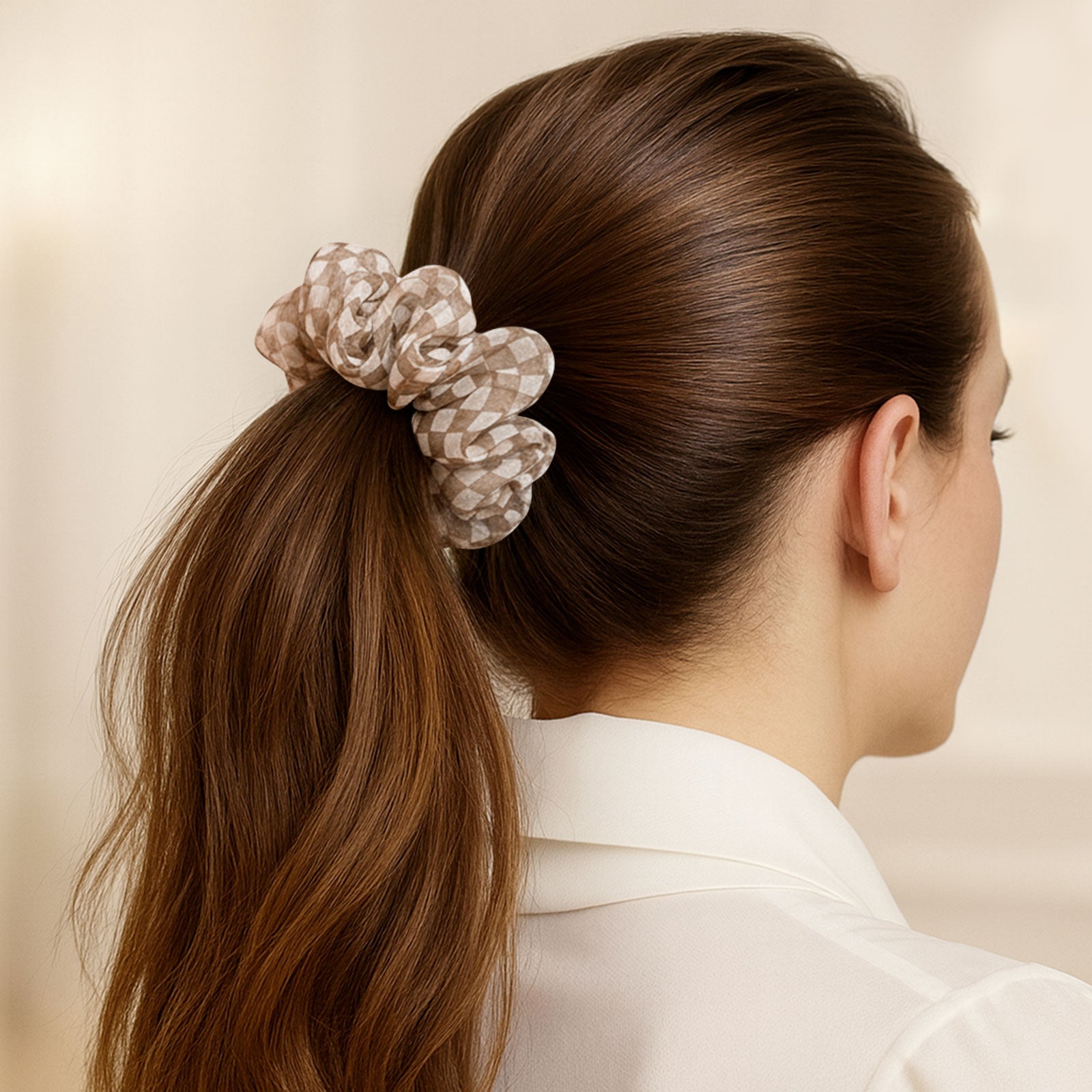 Le chouchou Anya revisite le classique damier avec légèreté. Son voile aérien aux nuances brunes et dorées joue avec la lumière à chaque mouvement. Sa texture fluide, légèrement transparente, lui donne un côté raffiné tout en restant facile à porter. Sa taille XXL apporte une belle ampleur aux cheveux, que ce soit pour un chignon lâche ou une queue-de-cheval souple.