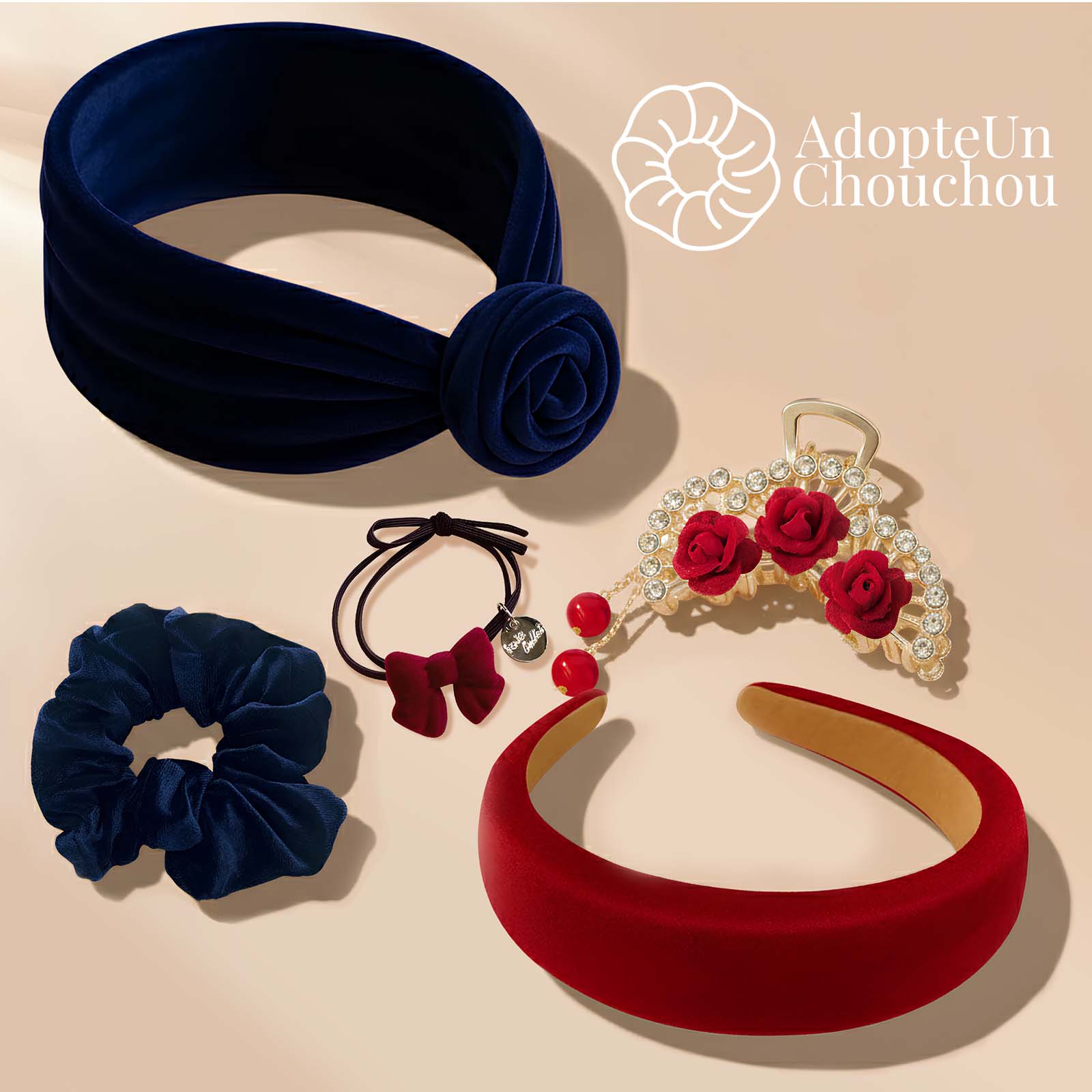 Chez Adopte un Chouchou, le coffret Velours & Lumière est né d’une envie de contraste : la profondeur des teintes d’automne mêlée à la douceur du velours. On a imaginé cet ensemble comme un petit moment à soi, celui où on prend le temps de se coiffer, d’ajuster un serre-tête, d’ajouter un détail qui change tout sans y penser. Les couleurs oscillent entre bleu nuit et bordeaux, les matières sont douces, enveloppantes, un peu comme une lumière tamisée un après-midi d’octobre. Chaque accessoire a ce petit quelque chose de réconfortant et d’élégant à la fois: des pièces simples, mais qui attirent le regard.