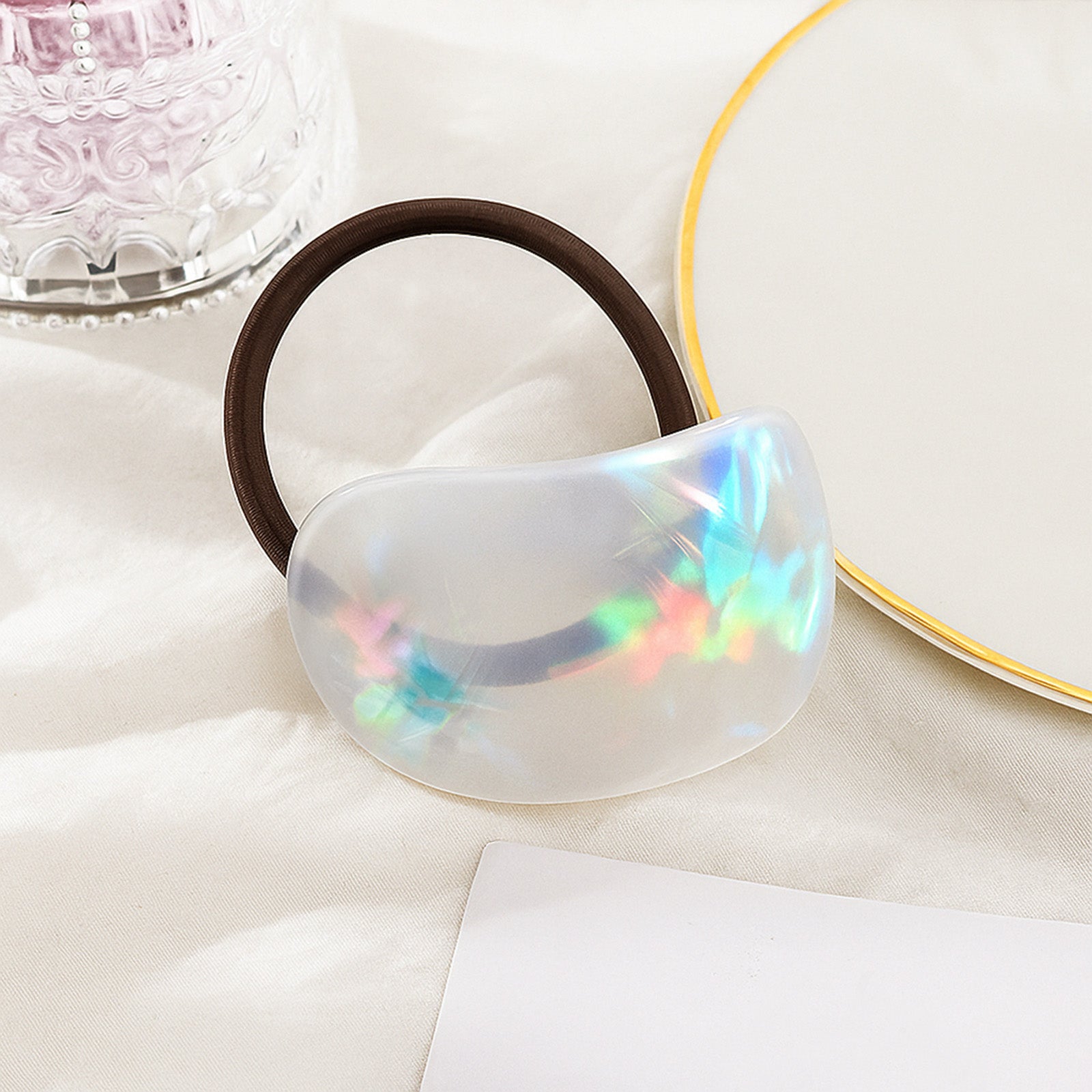 L’élastique Karmen s’insère dans la chevelure comme un détail pensé mais discret. Sa perle marbrée en résine, aux reflets minéraux et aux teintes nuancées, rappelle les pierres polies par le temps: une esthétique organique qui mêle douceur visuelle et présence assumée. C’est une matière qui ne crie pas, mais qui affirme, tout en retenue.