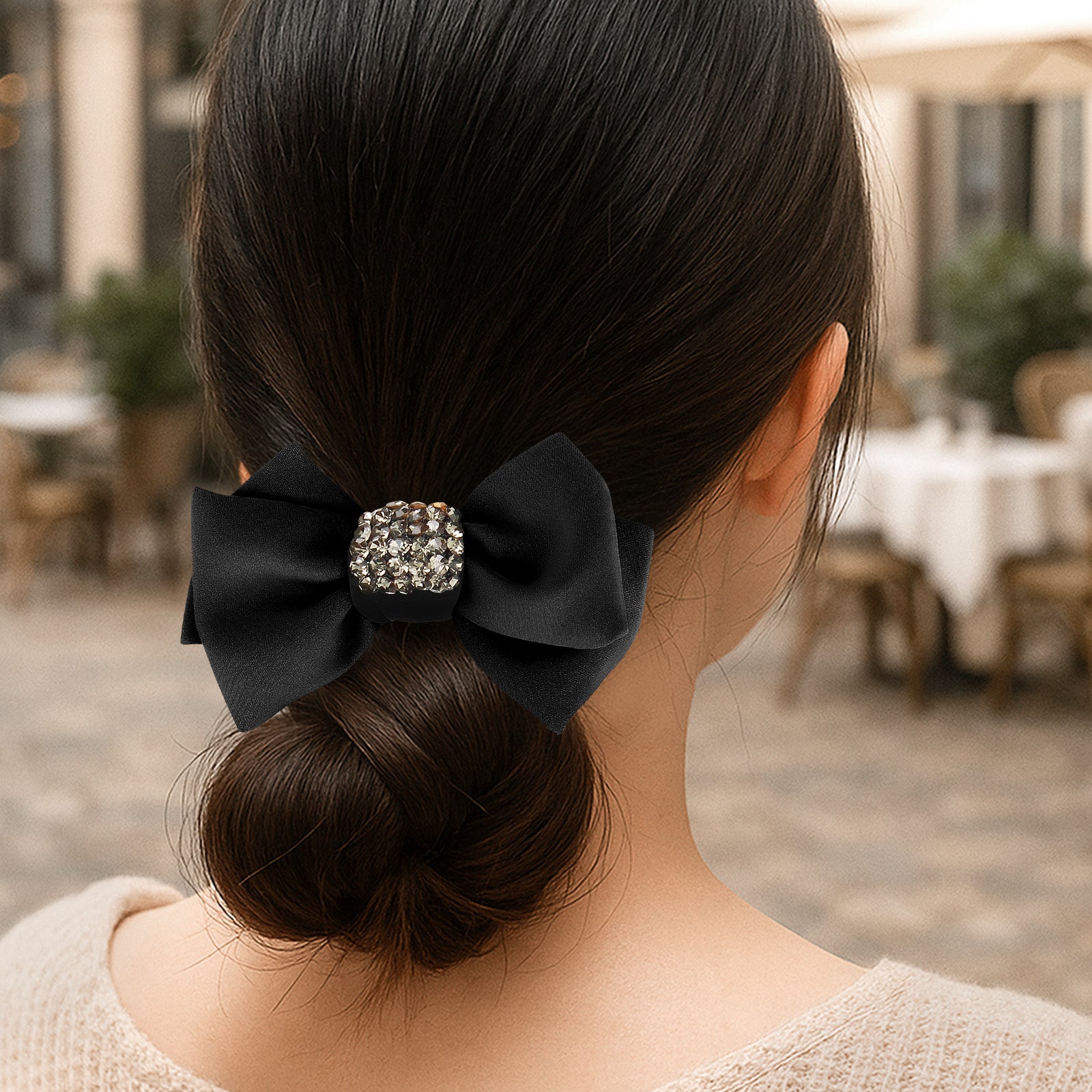 Un classique revisité avec une touche chic. L’élastique Marcella noir, orné d’un petit nœud et de strass discrets, apporte juste ce qu’il faut d’éclat à la coiffure. Sa couleur profonde et ses détails lumineux lui donnent un style élégant et facile à porter, aussi bien au quotidien que pour une occasion spéciale.