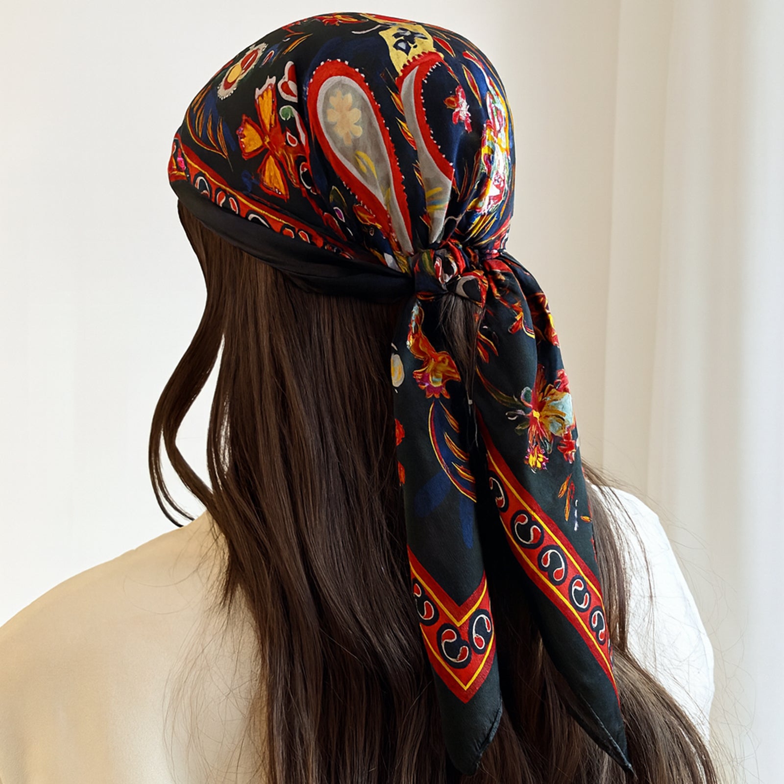 Son imprimé riche mêle motifs floraux et arabesques dans des tons profonds: rouge grenat, bleu nuit, vert forêt et or vieilli sur fond noir intense. Une palette vibrante et sophistiquée, parfaite pour sublimer une tenue monochrome ou ajouter une touche artistique à un look minimaliste.