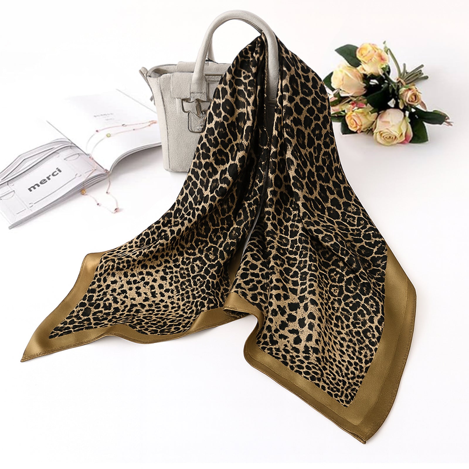 Son imprimé léopard revisité mêle des taches noires sur fond fauve, encadré d’un bord doré chaleureux. Une palette terreuse et affirmée, parfaite pour réveiller une tenue neutre ou ajouter une touche féline à un look urbain. Chic et audacieux, il évoque une féminité libre, instinctive et pleine de caractère.