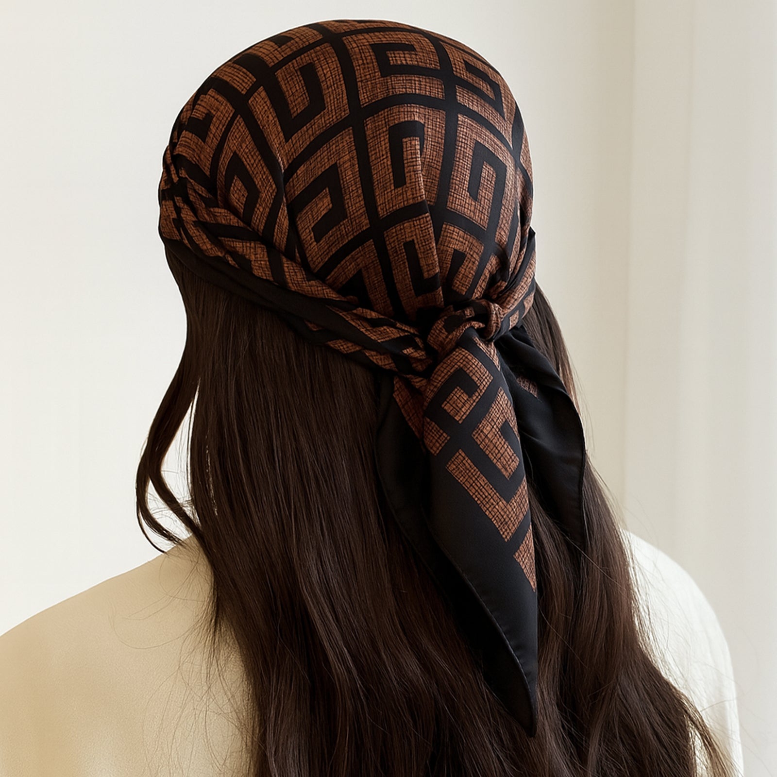 Son imprimé Méandres dorés mêle des nuances de brun, de caramel et d’or dans un motif graphique et structuré. Une palette chaude et sophistiquée, idéale pour rehausser une tenue minimaliste ou accompagner un look chic et intemporel.