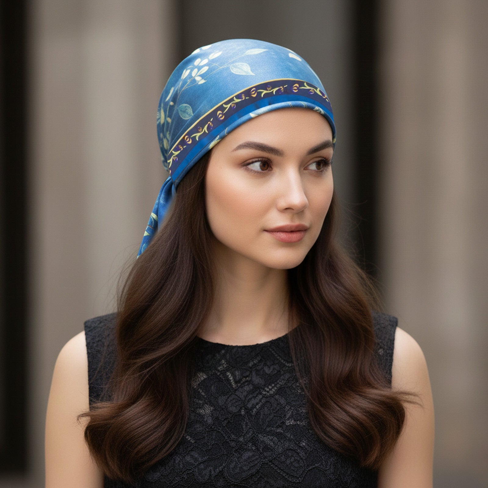 Le foulard carré Bleu Couture se distingue par son imprimé floral délicat, déployé sur un fond bleu profond aux reflets subtils. Les motifs végétaux, ponctués de touches claires et de lignes décoratives contrastées, créent une composition élégante et équilibrée. La bordure graphique vient structurer l’ensemble et souligne le caractère soigné du dessin.