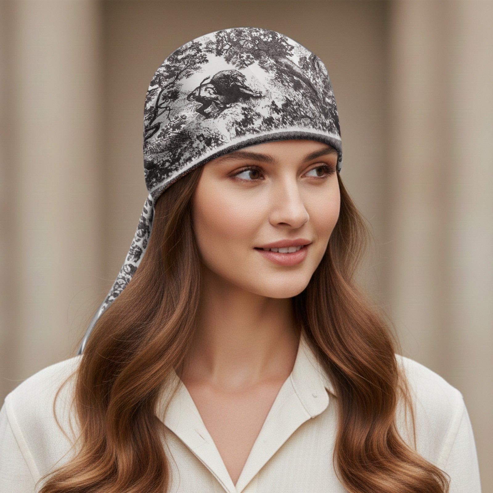 Le foulard carré Black Baroque Edition dévoile un imprimé illustratif d’inspiration classique, où les motifs détaillés se déploient dans un jeu de contrastes noir et ivoire. Les scènes finement dessinées évoquent l’esthétique baroque, tout en conservant une lecture moderne et épurée. La bordure graphique encadre l’ensemble avec précision et renforce la profondeur du motif.