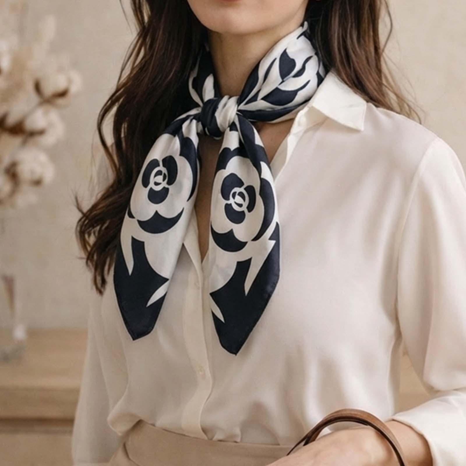 Un foulard carré au motif graphique qui capte le regard avec élégance. Les rosaces noir profond se dessinent sur un fond ivoire lumineux, créant un contraste net et raffiné.