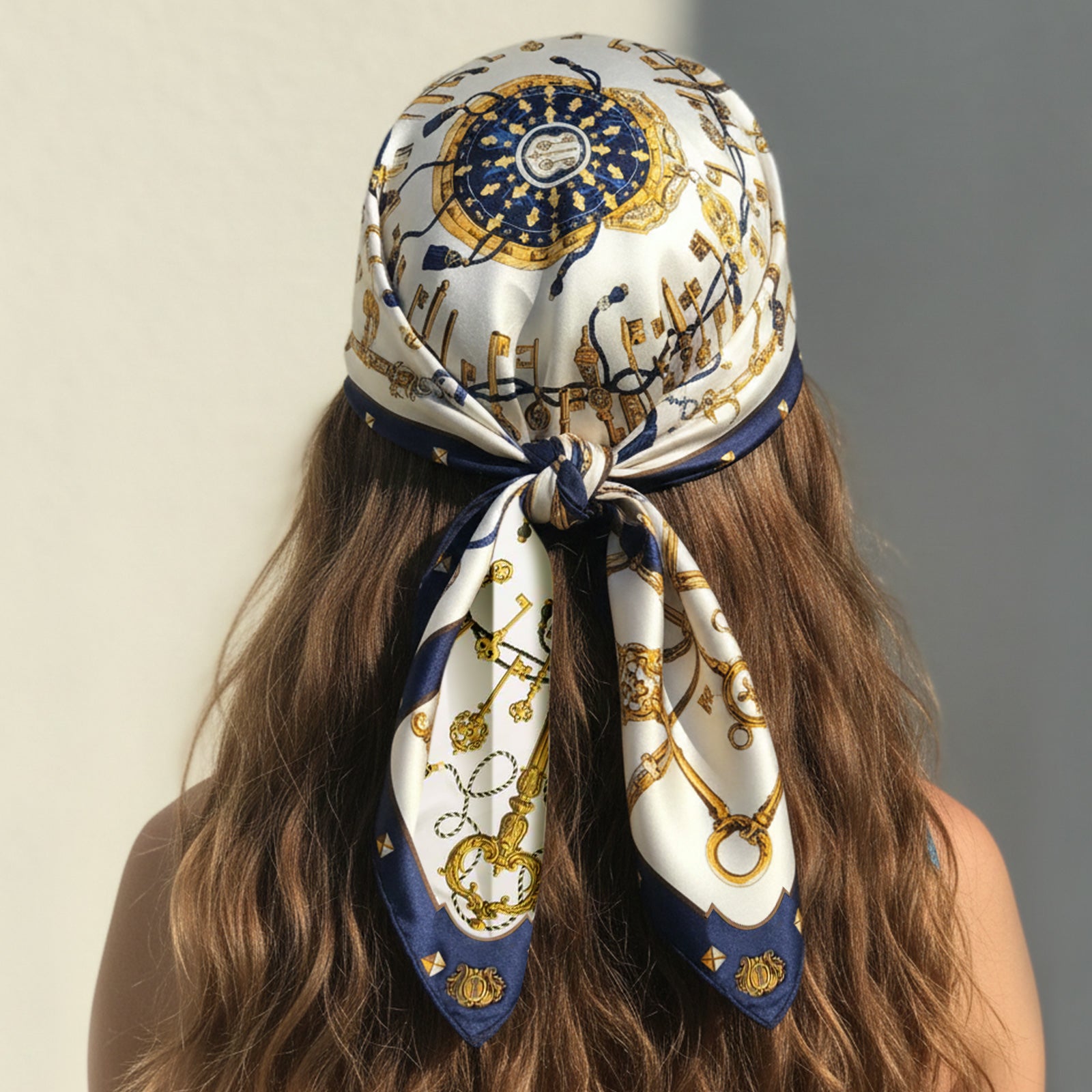 Le foulard carré Royal Keys dévoile un imprimé décoratif inspiré des symboles précieux et des ornements d’apparat. Les clés finement illustrées s’organisent autour d’un motif central, dans une palette harmonieuse mêlant bleu profond, ivoire lumineux et touches dorées. La composition, riche et équilibrée, évoque une élégance classique revisitée avec modernité.