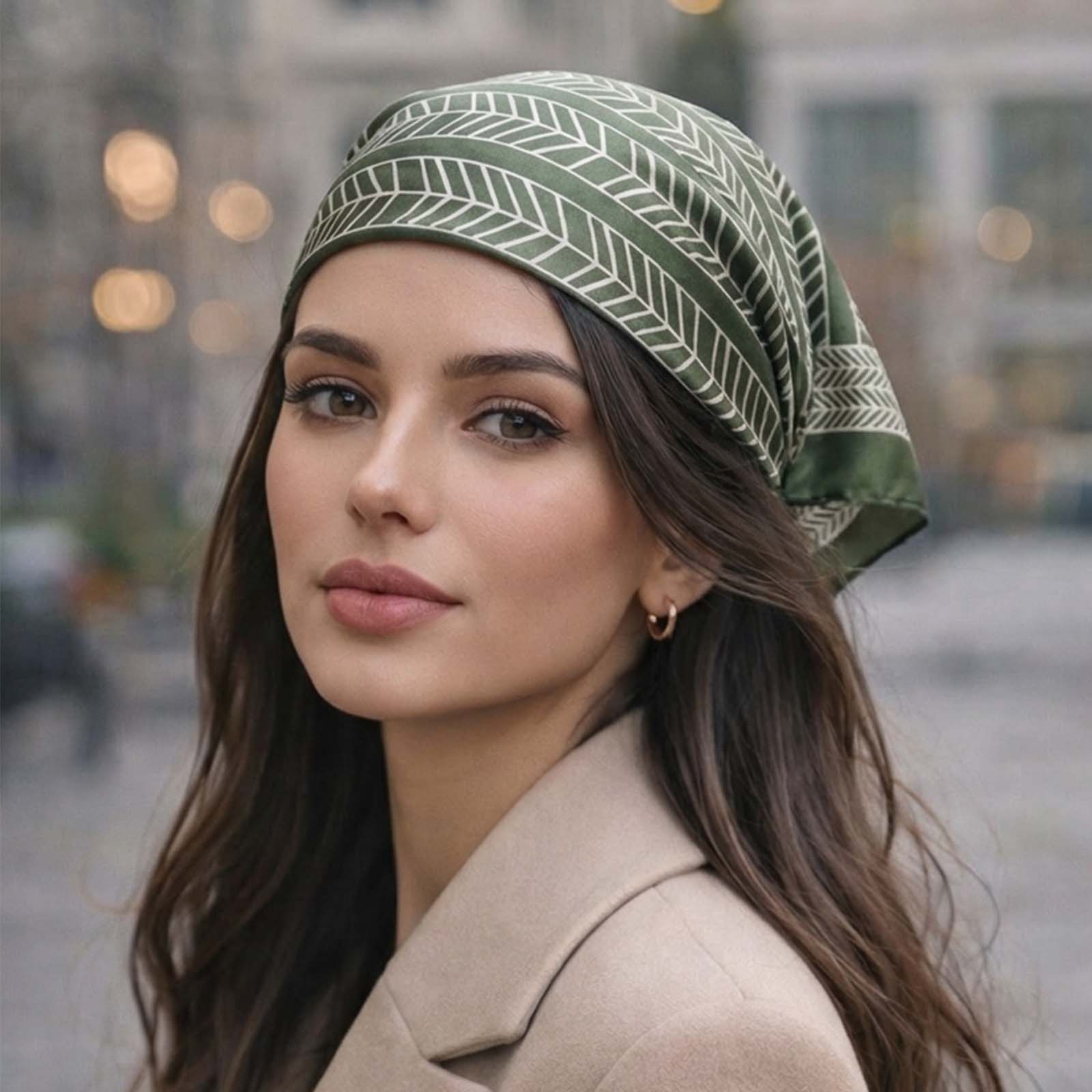 Un foulard carré aux teintes profondes et apaisantes. Son vert forêt, relevé par un motif graphique clair, crée un contraste subtil qui apporte du relief sans être trop marqué.