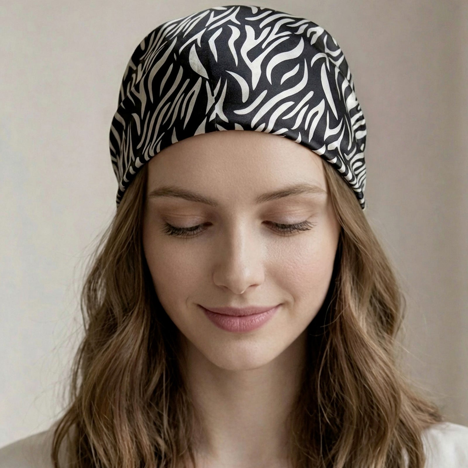 Un foulard carré au motif zébré revisité dans un esprit graphique. Les lignes noires et blanches se croisent avec fluidité, créant un effet visuel dynamique et moderne.