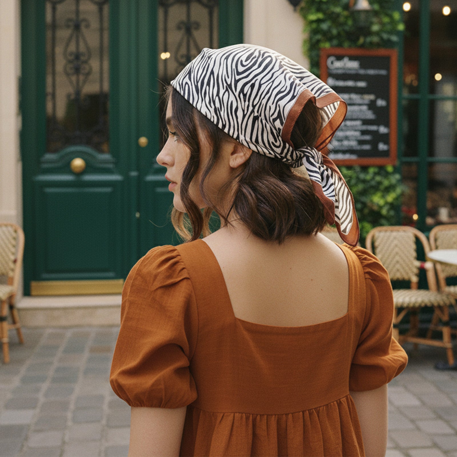 Le foulard Zebra Stripes affiche un motif zébré audacieux qui allie élégance et modernité. Ses rayures contrastées noir et ivoire donnent du caractère à chaque tenue, qu’il soit porté autour du cou, dans les cheveux ou en accessoire de sac.