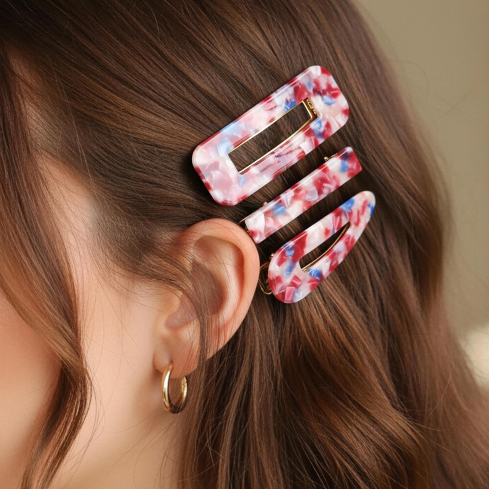 Profondes et mystérieuses, ces pinces plates en résine marbrée turquoise et rose évoquent les reflets marins d’Atlantis. Leur effet marbre intense joue avec la lumière pour un rendu sophistiqué.