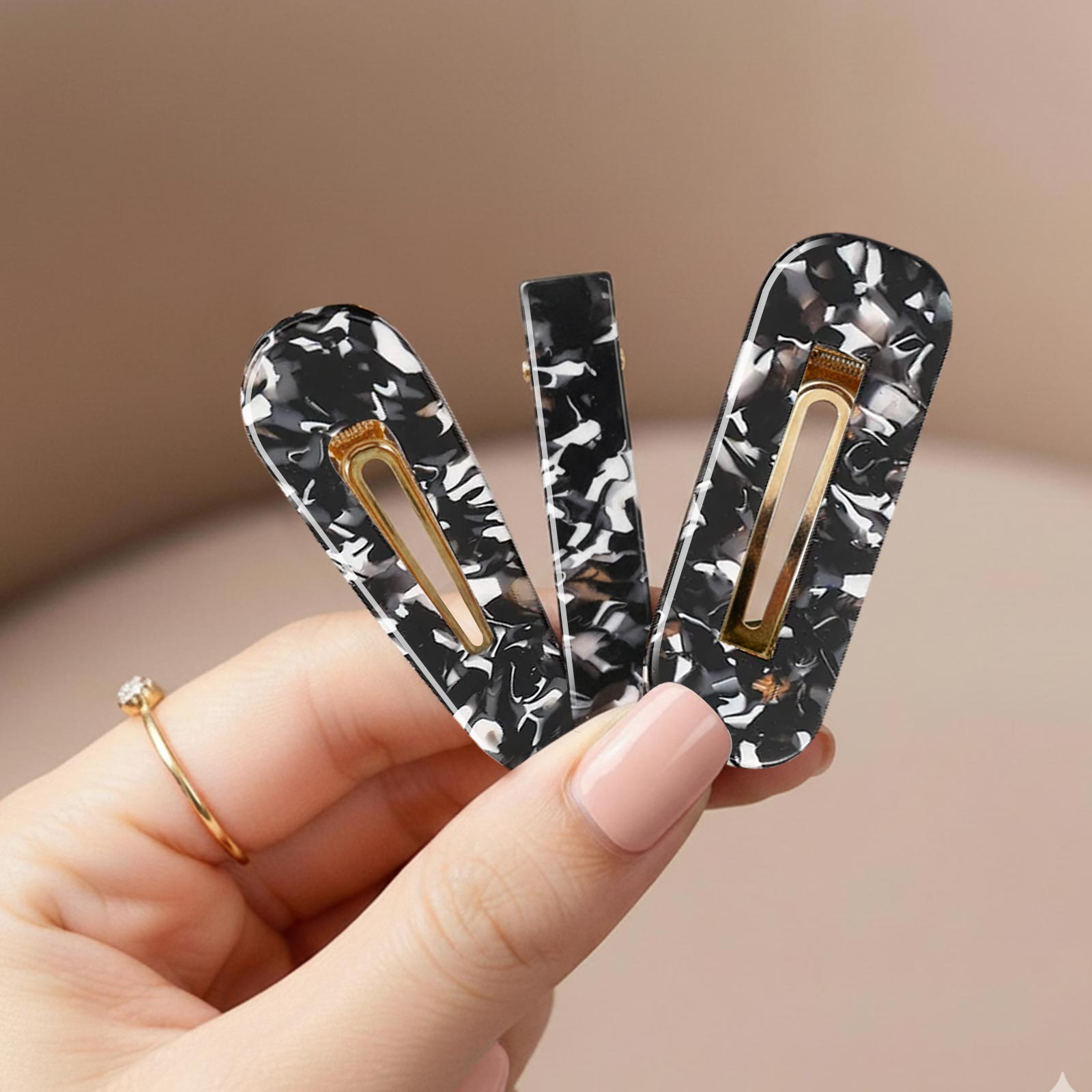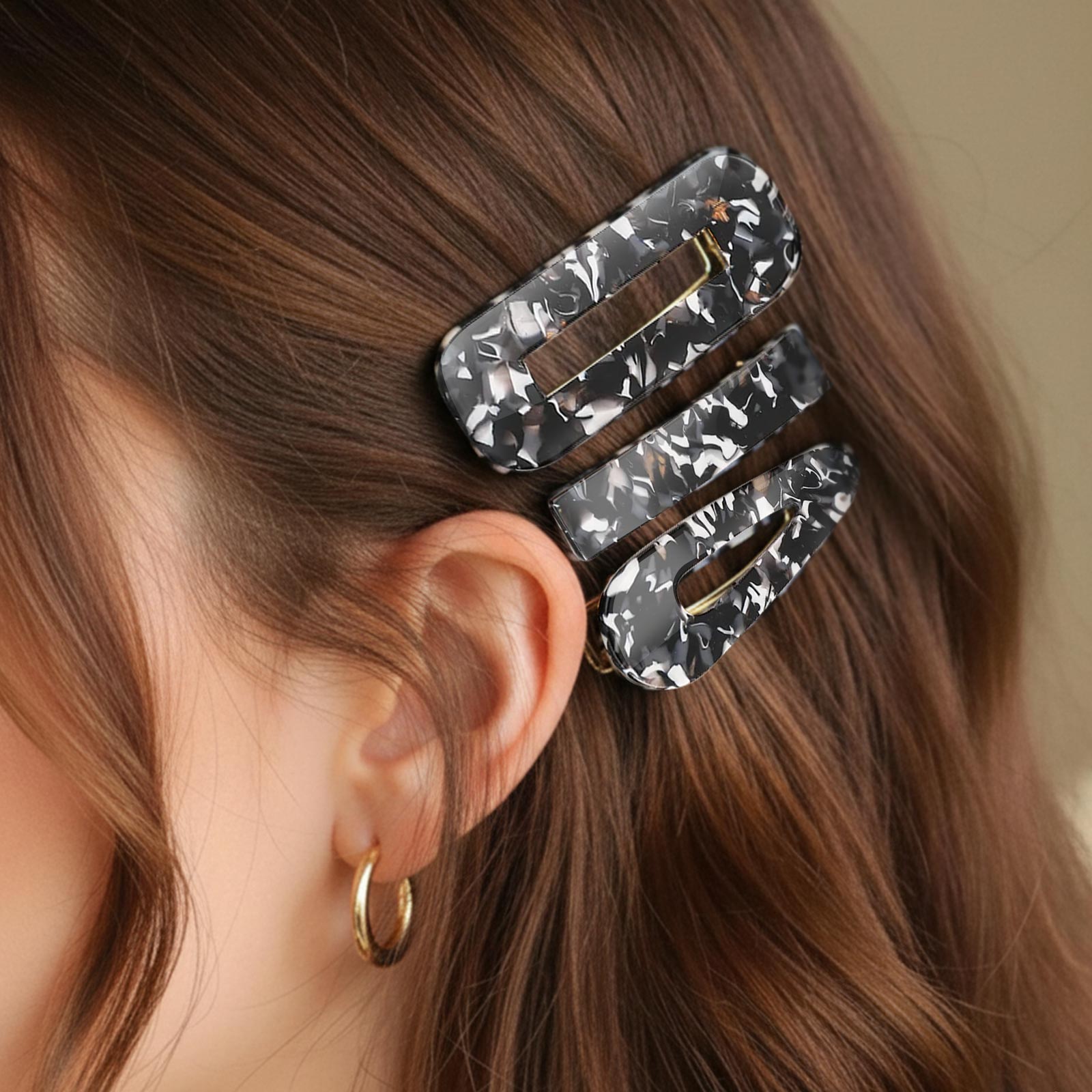 Chic et graphique, ce lot de pinces plates en résine marbrée noir et blanc revisite l’élégance intemporelle du monochrome. Leur effet marbré crée de la profondeur tout en restant sobre.