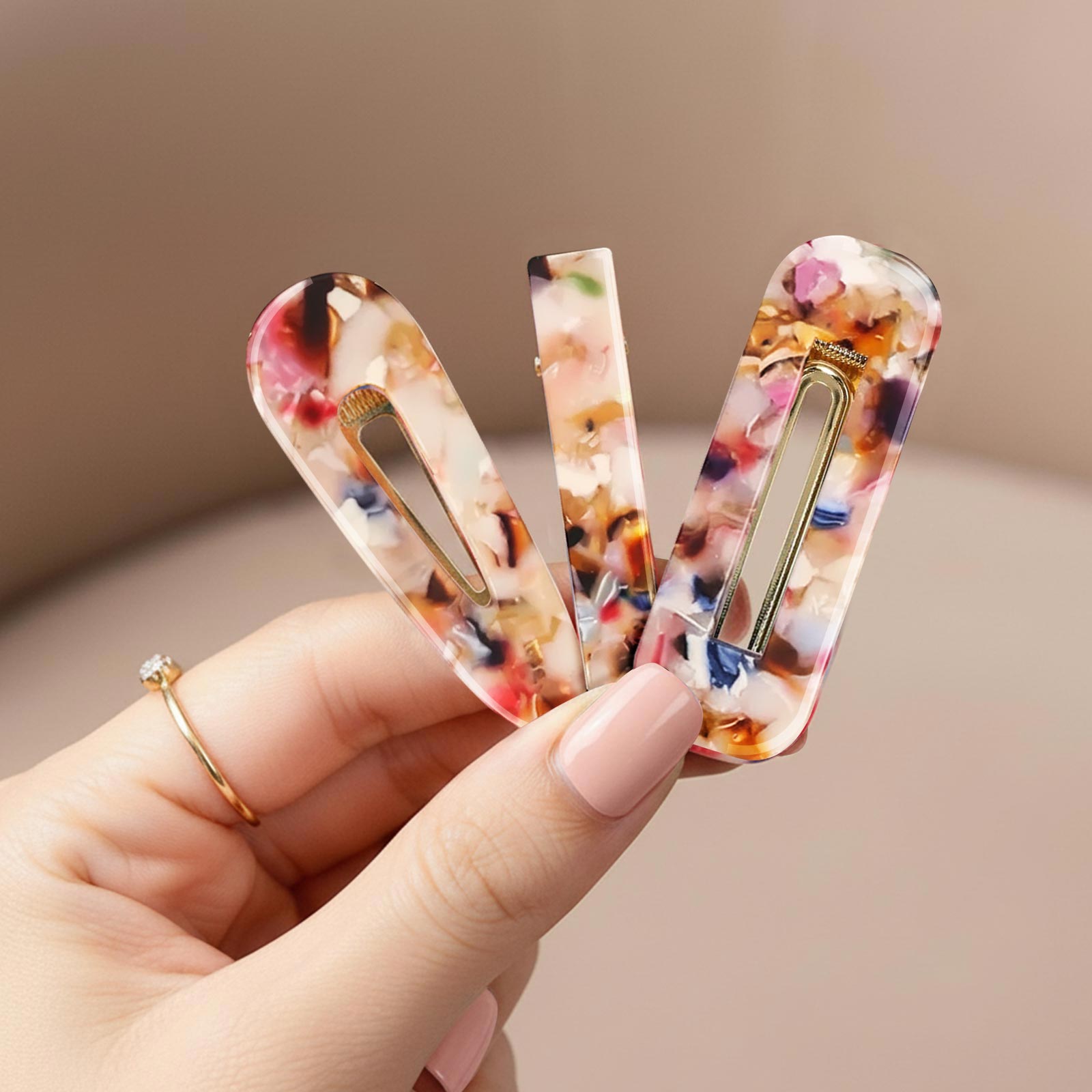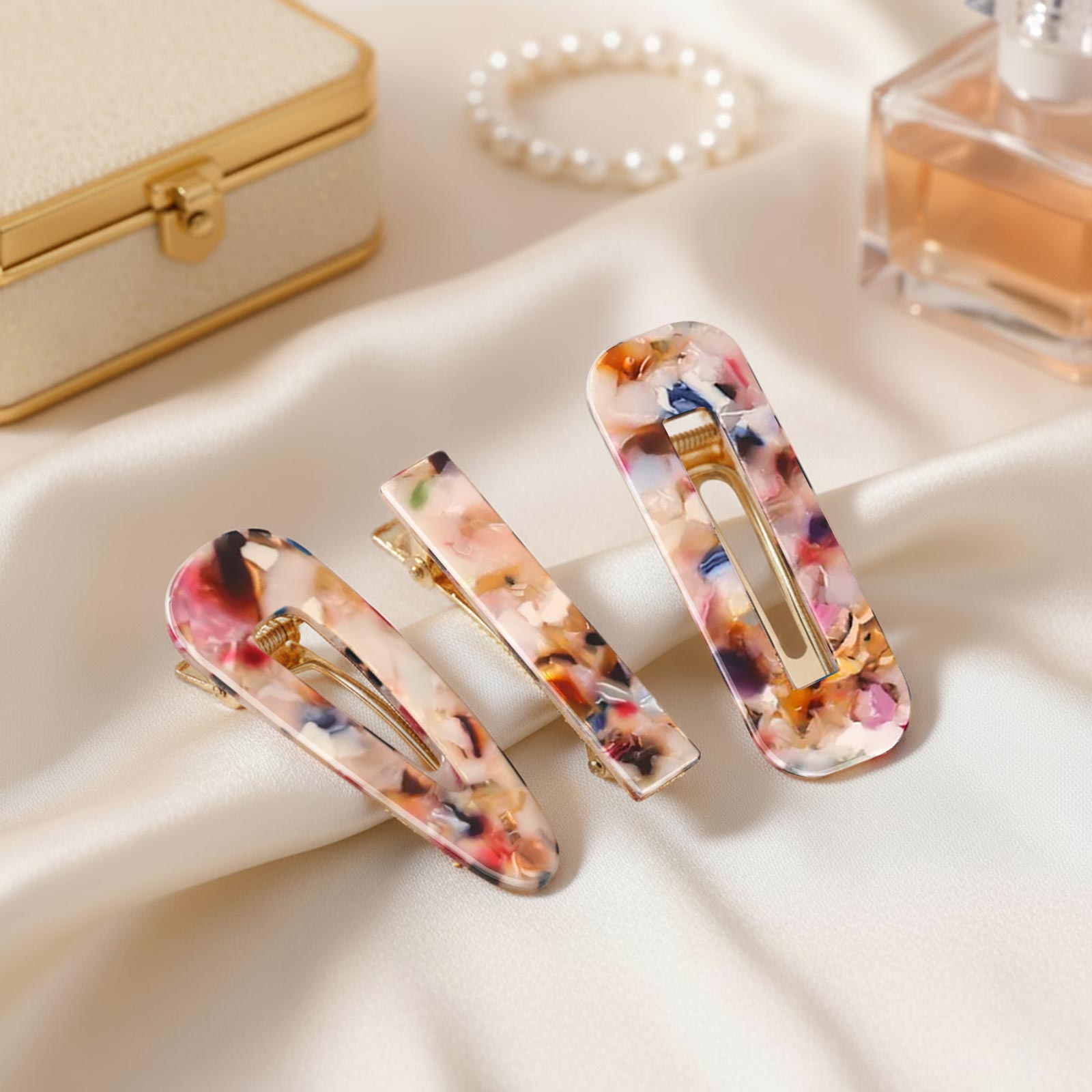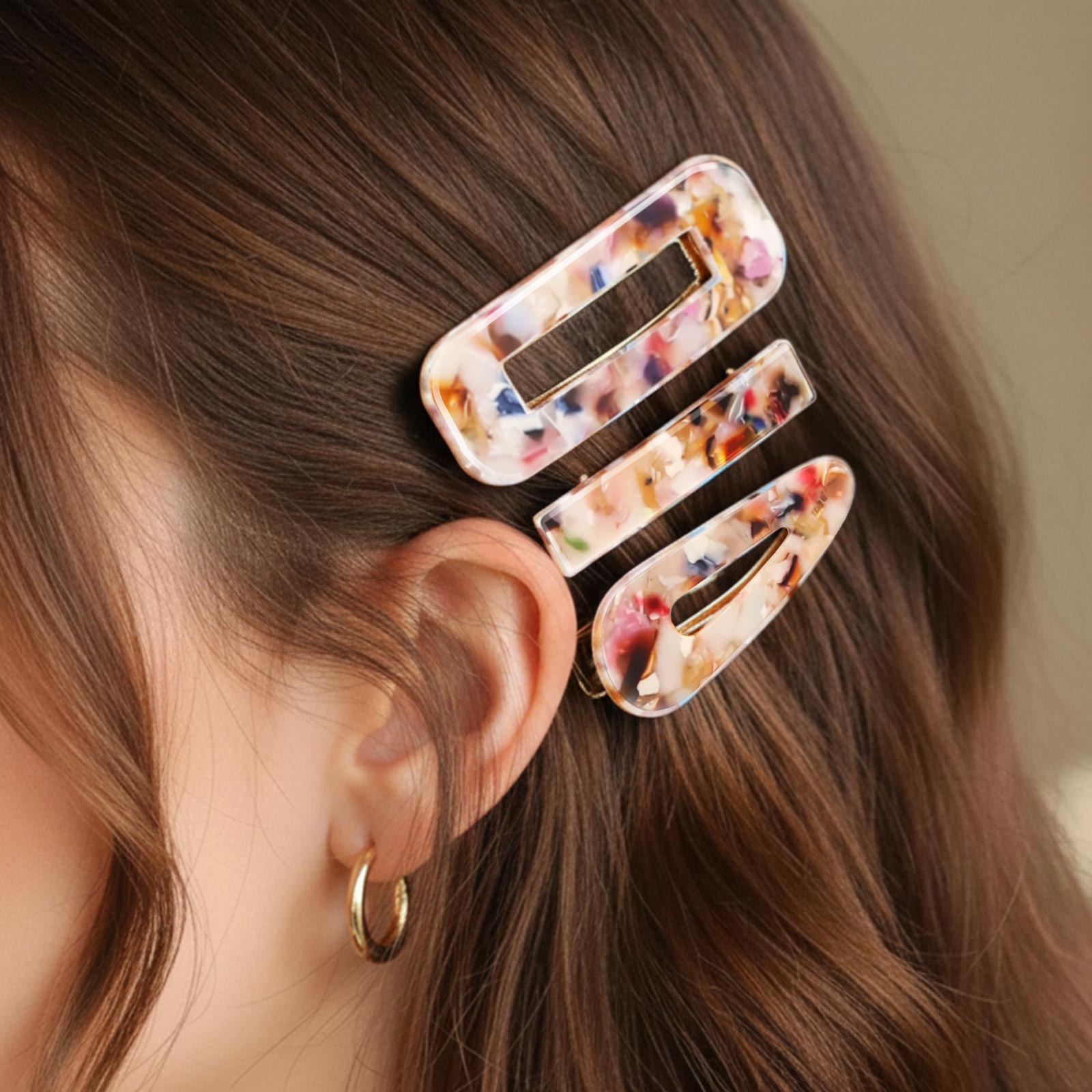 Vives et colorées, ces trois pinces plates en résine effet mosaïque jouent avec les contrastes. Leur mélange de tons éclatants crée un style original et pétillant.