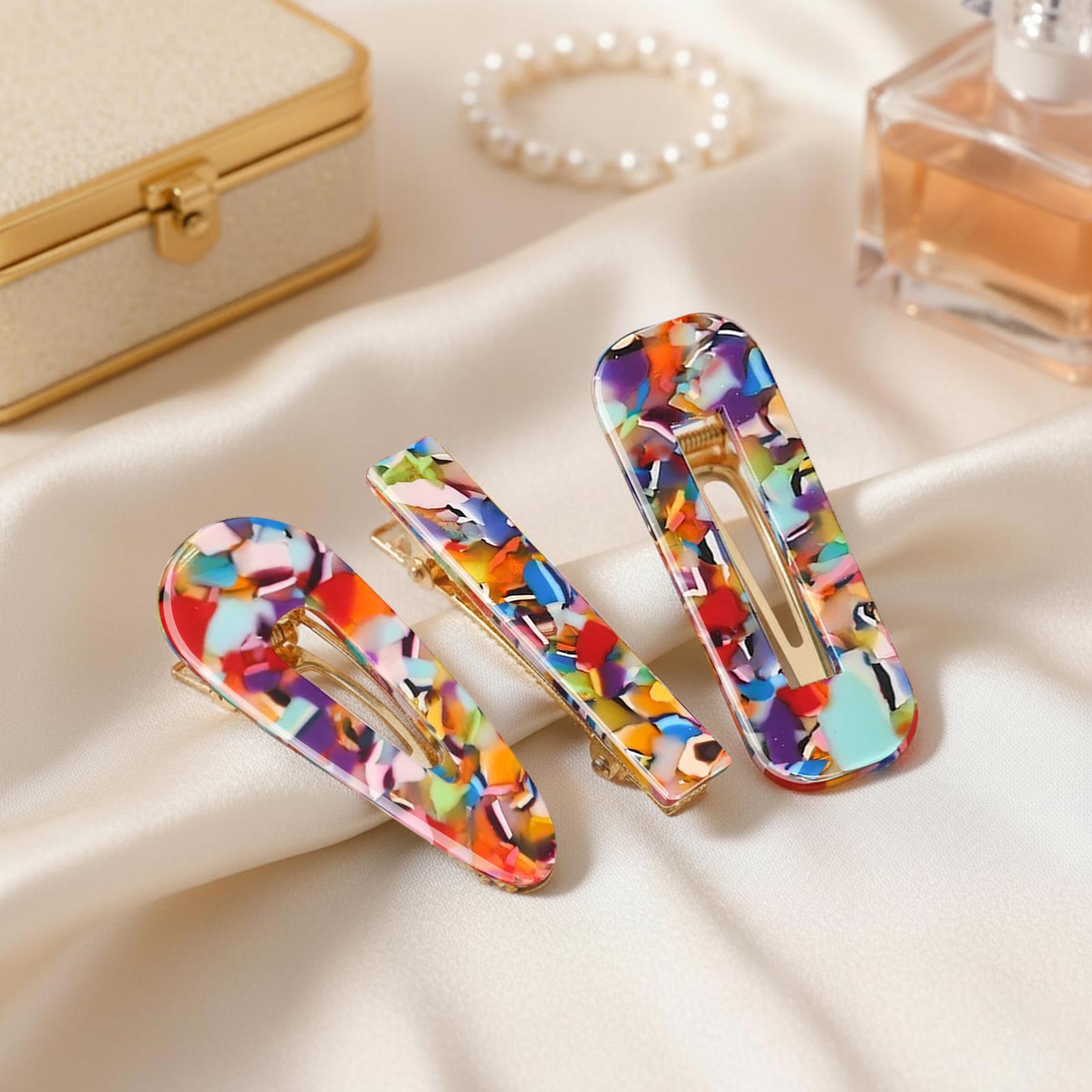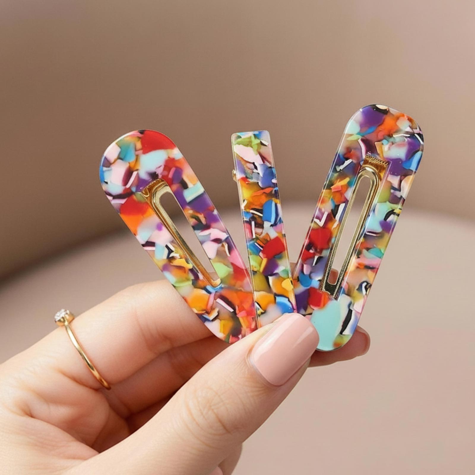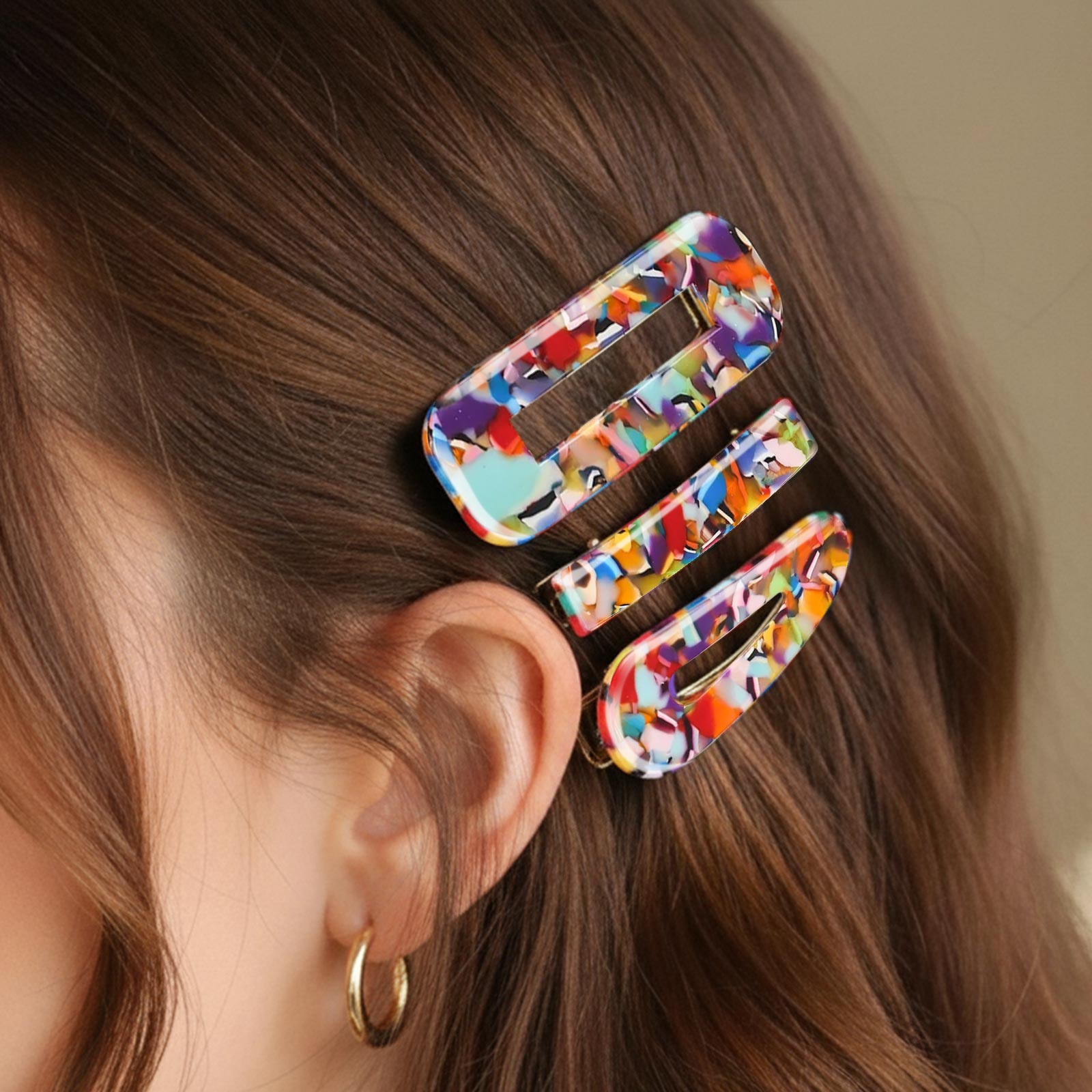 Avec leurs éclats multicolores façon terrazzo, ces trois pinces plates apportent une touche ludique et moderne à la coiffure. Chaque barrette en résine joue avec la lumière et les contrastes, créant un effet pétillant sans effort.