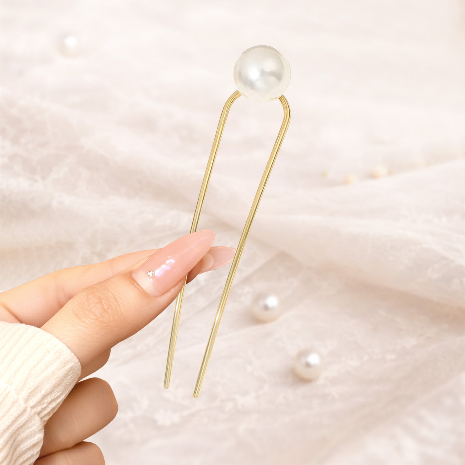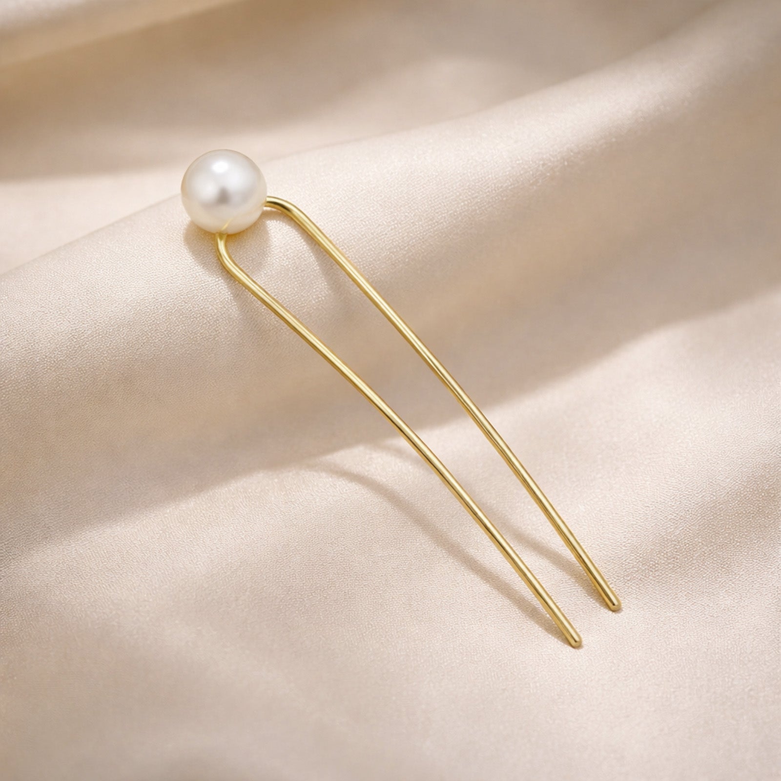 Ce pic à chignon doré sublime les coiffures avec une touche minimaliste et élégante. Sa ligne fine en forme de U est rehaussée d’une perle ronde nacrée qui apporte douceur et lumière à l’ensemble.