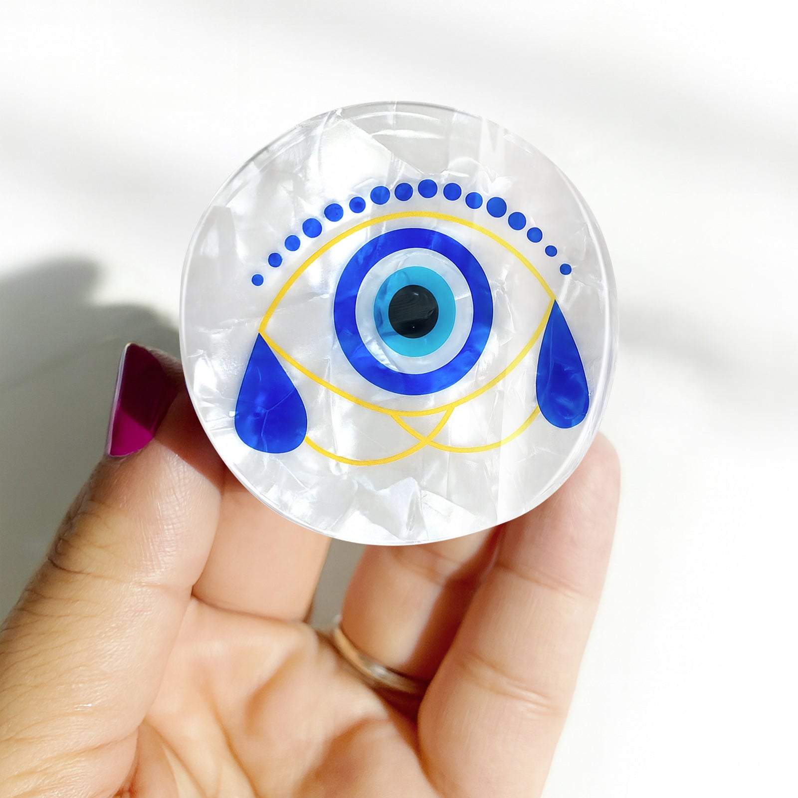 Ajoute une aura mystique à ta coiffure avec la Pince Cheveux Mirage Ayin Hara. Inspirée du symbole ancestral de l’« Ayin Hara », l’œil protecteur contre les énergies négatives cette pince allie spiritualité et style.