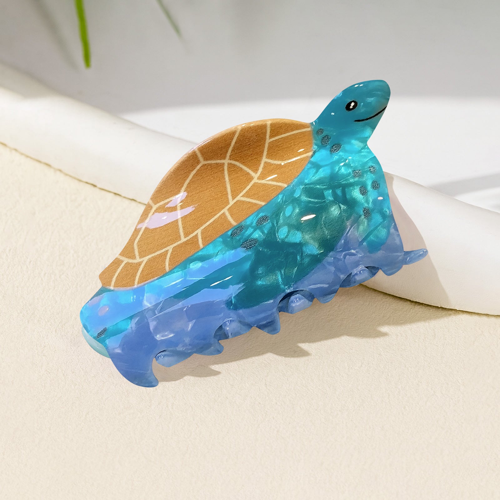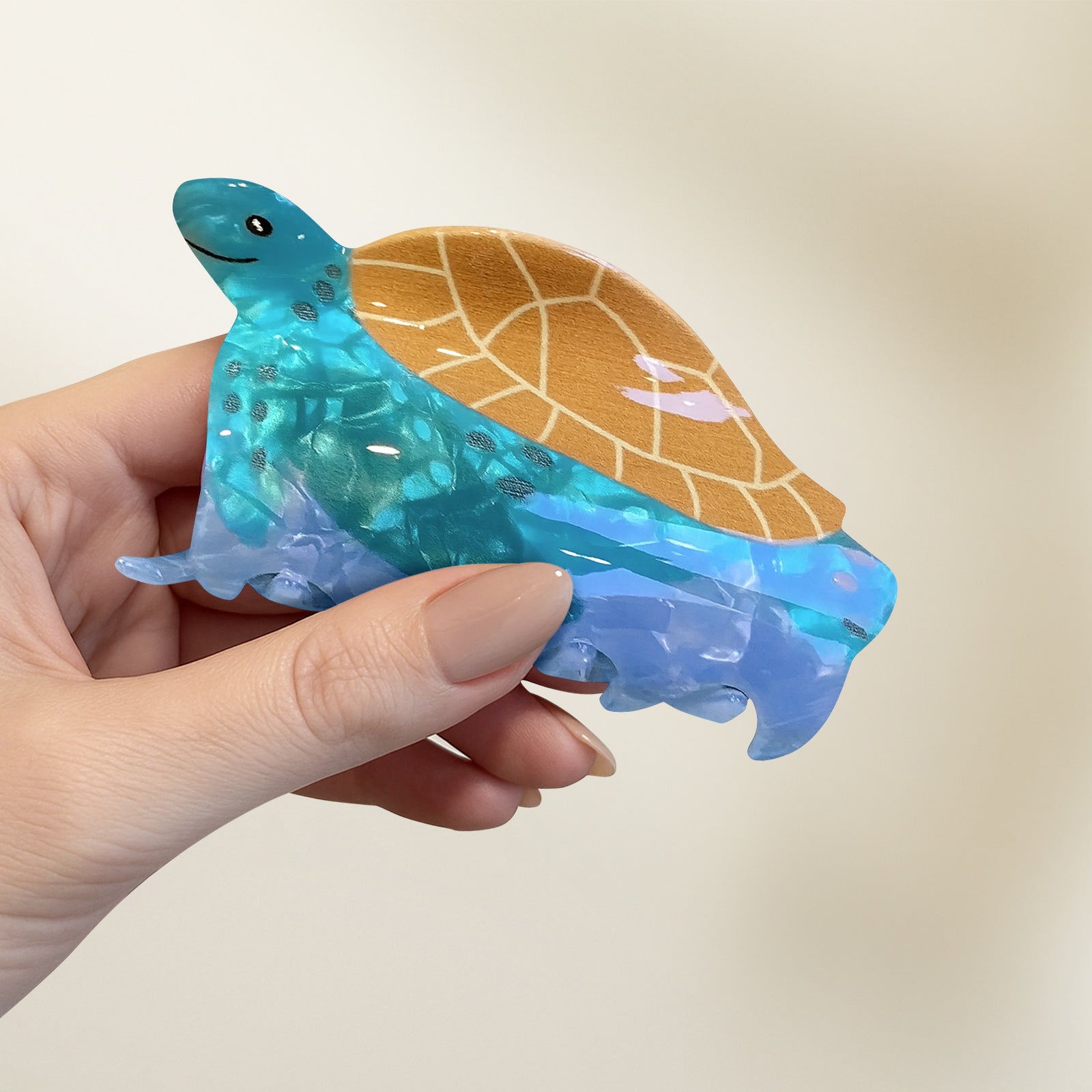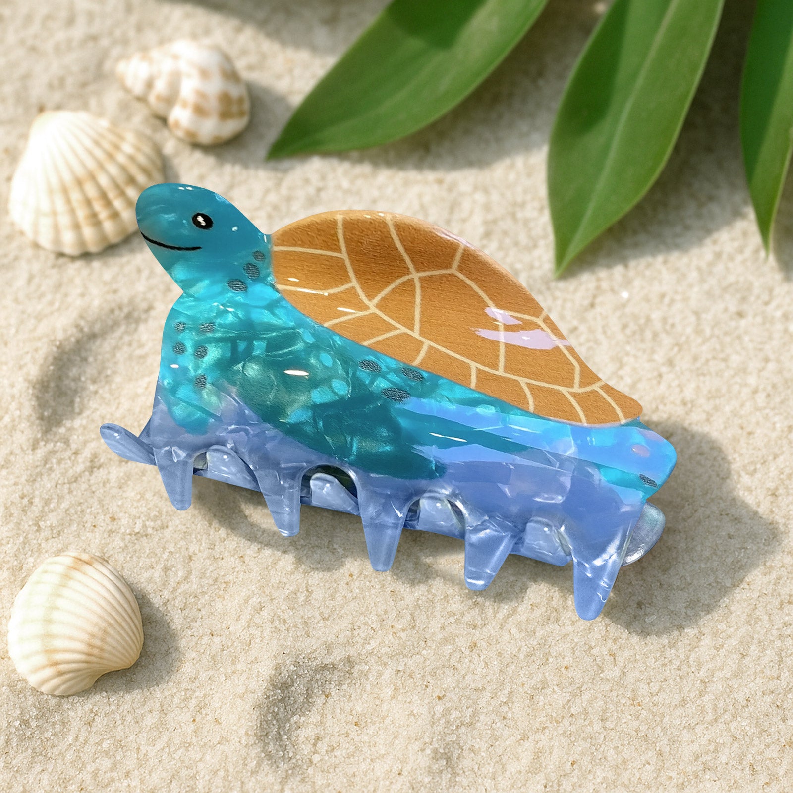 Plonge dans l’univers marin avec la Pince Cheveux Tropicool Umi No Kame. Inspirée du mot japonais Umi no Kame (海のカメ), qui signifie “tortue de l’océan”, cette pince met en valeur une tortue marine stylisée aux couleurs vives et nacrées.