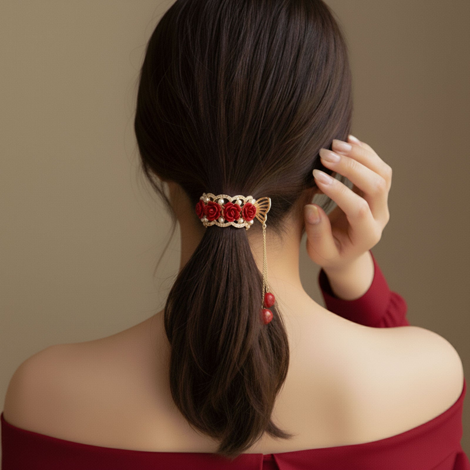 Affirmez votre élégance avec la Pince Crabe Ivory Blossom Bordeaux. Ornée de superbes roses en velours bordeaux, de perles délicates et de cristaux scintillants, elle incarne le raffinement et la passion. Son design doré sophistiqué est sublimé par un pendentif chaîne orné de perles rouges, ajoutant une touche de glamour unique à vos coiffures.
