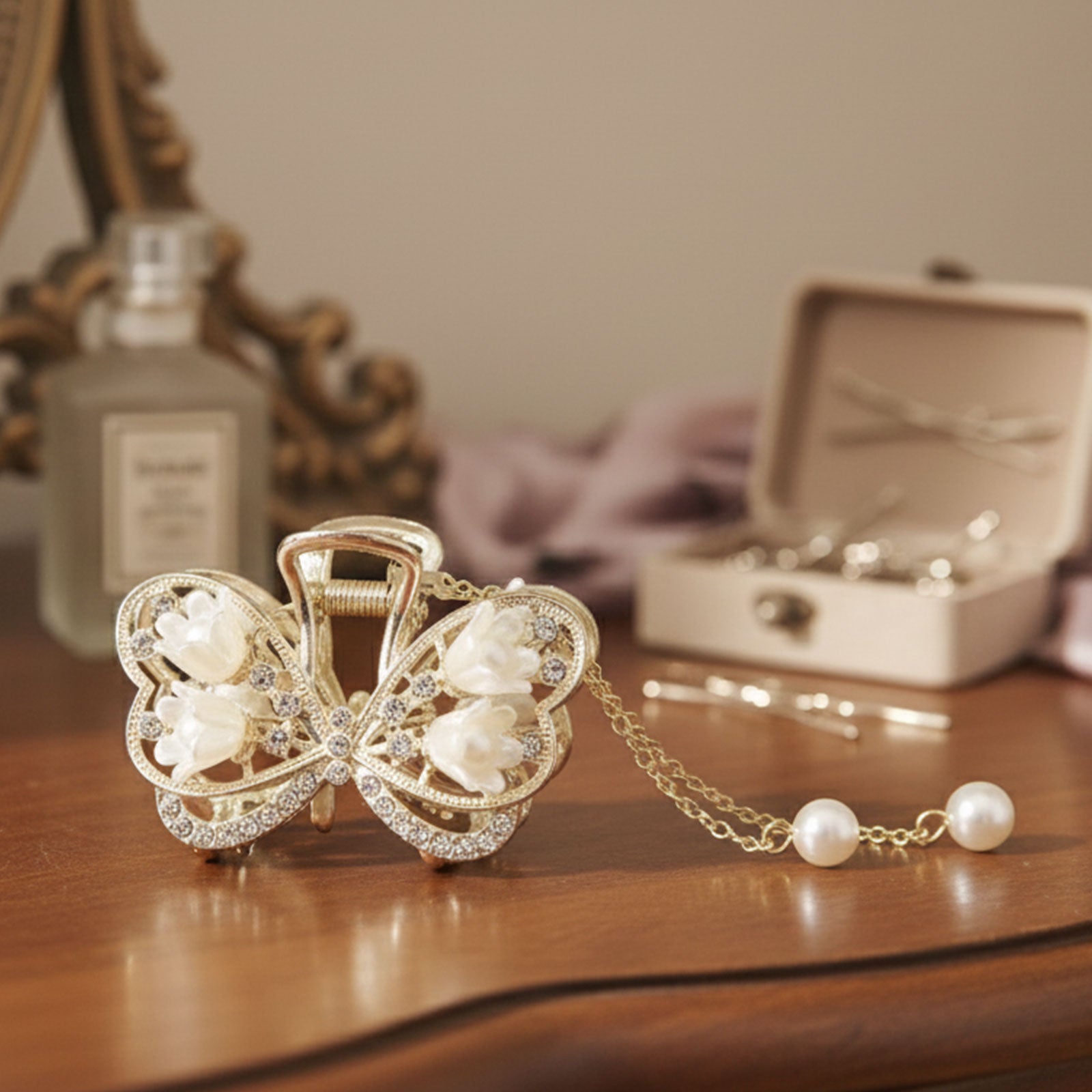 Apportez une touche de délicatesse et d’élégance à vos coiffures avec la Pince Crabe Lily Wings Blanc. Inspirée de la légèreté d’un papillon, elle associe une structure dorée ornée de strass scintillants à de jolies fleurs blanches nacrées et des perles pendantes raffinées. Véritable bijou capillaire, elle maintient vos cheveux avec confort tout en apportant une note romantique et sophistiquée.