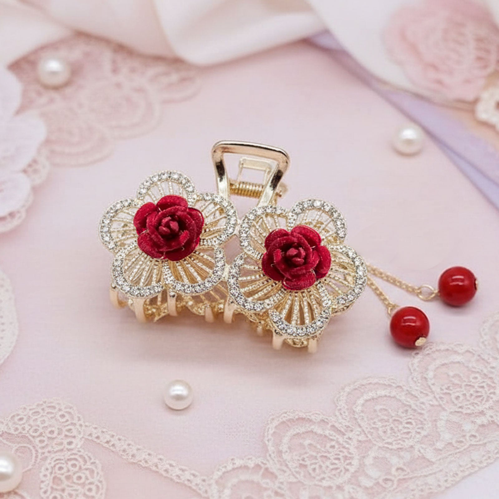 Affirmez votre style avec la Pince Crabe Rose & Pearl Bordeaux. Ornée de deux roses en velours bordeaux d’une intensité captivante et sublimée par une élégante structure dorée, elle respire le charme et la féminité. Ses pendentifs délicats ornés de perles rouges apportent une touche raffinée et romantique, transformant cette pince en véritable bijou pour vos cheveux.