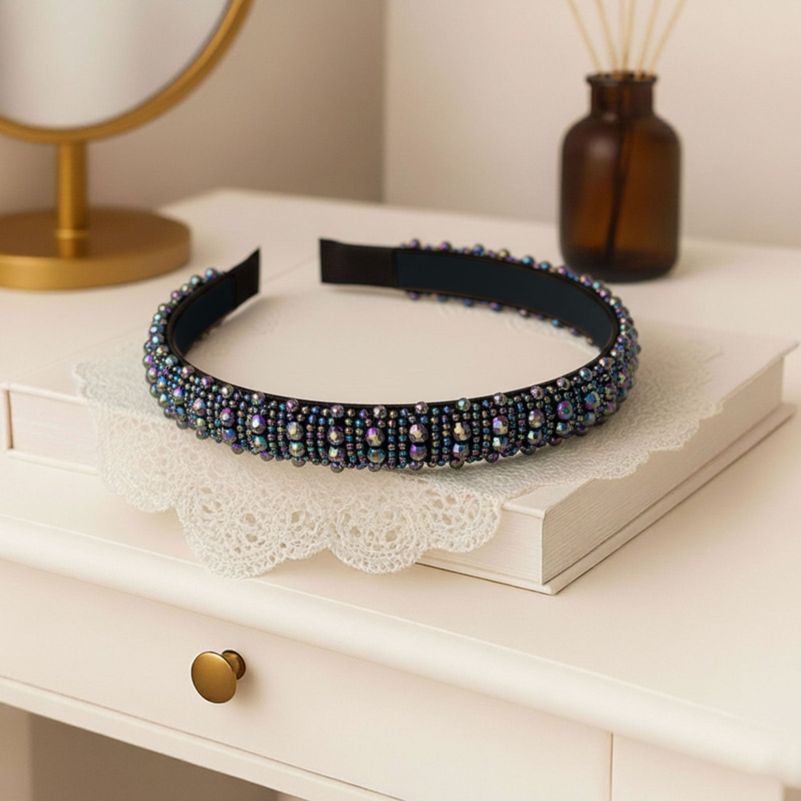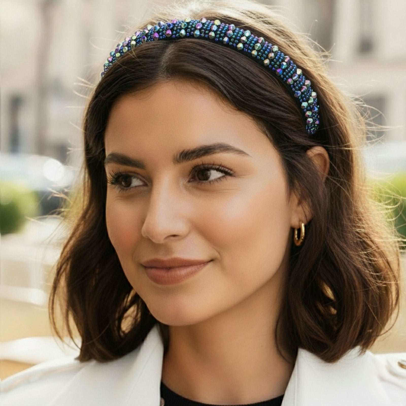 Matière : Base en tissu doux, ornée de perles facettées et de séparateurs métalliques raffinés