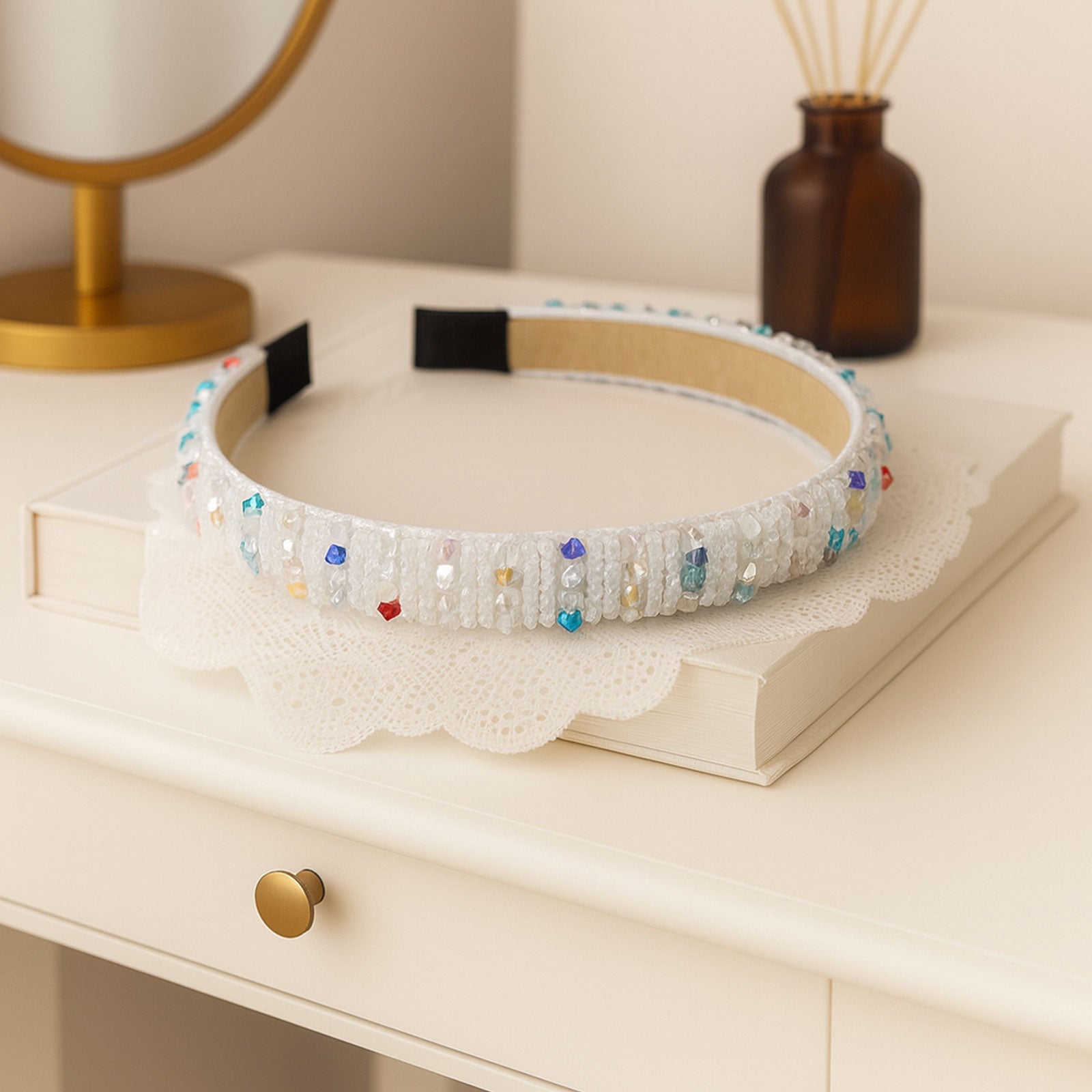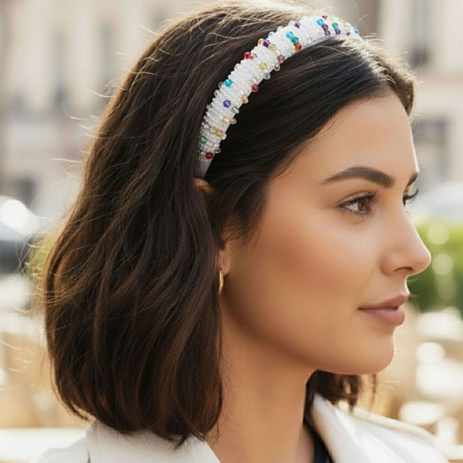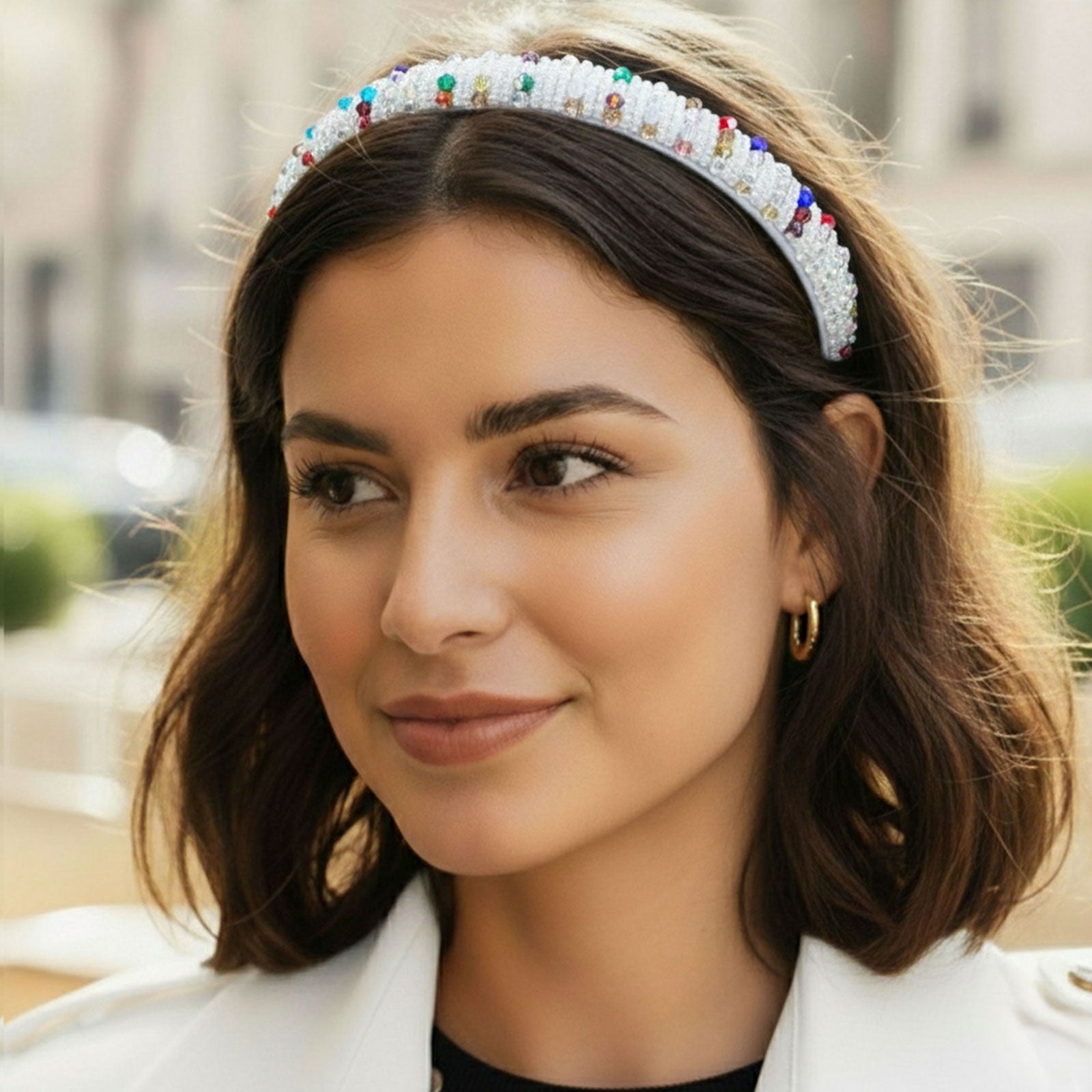Ajoutez de la couleur et de la gaieté à vos coiffures avec le serre-tête blanc en perles décoratives multicolores. Son mélange éclatant de teintes vives sur une base blanche lumineuse apporte une touche joyeuse et originale à votre style.