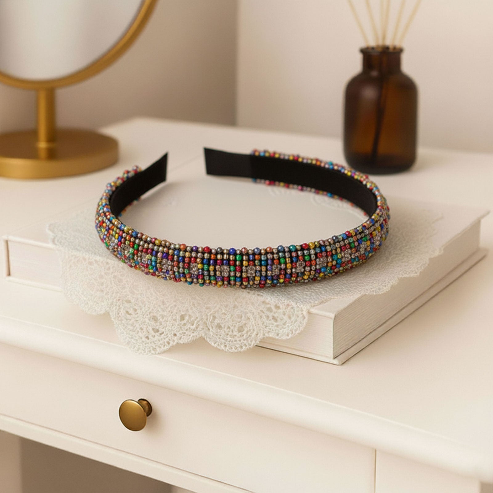 Matière : Base en tissu doux, ornée de perles facettées et de séparateurs métalliques raffinés