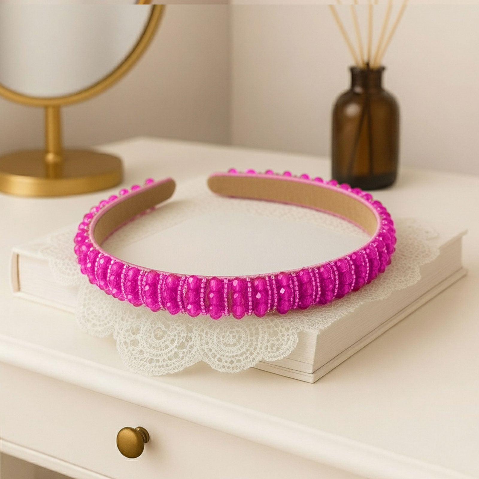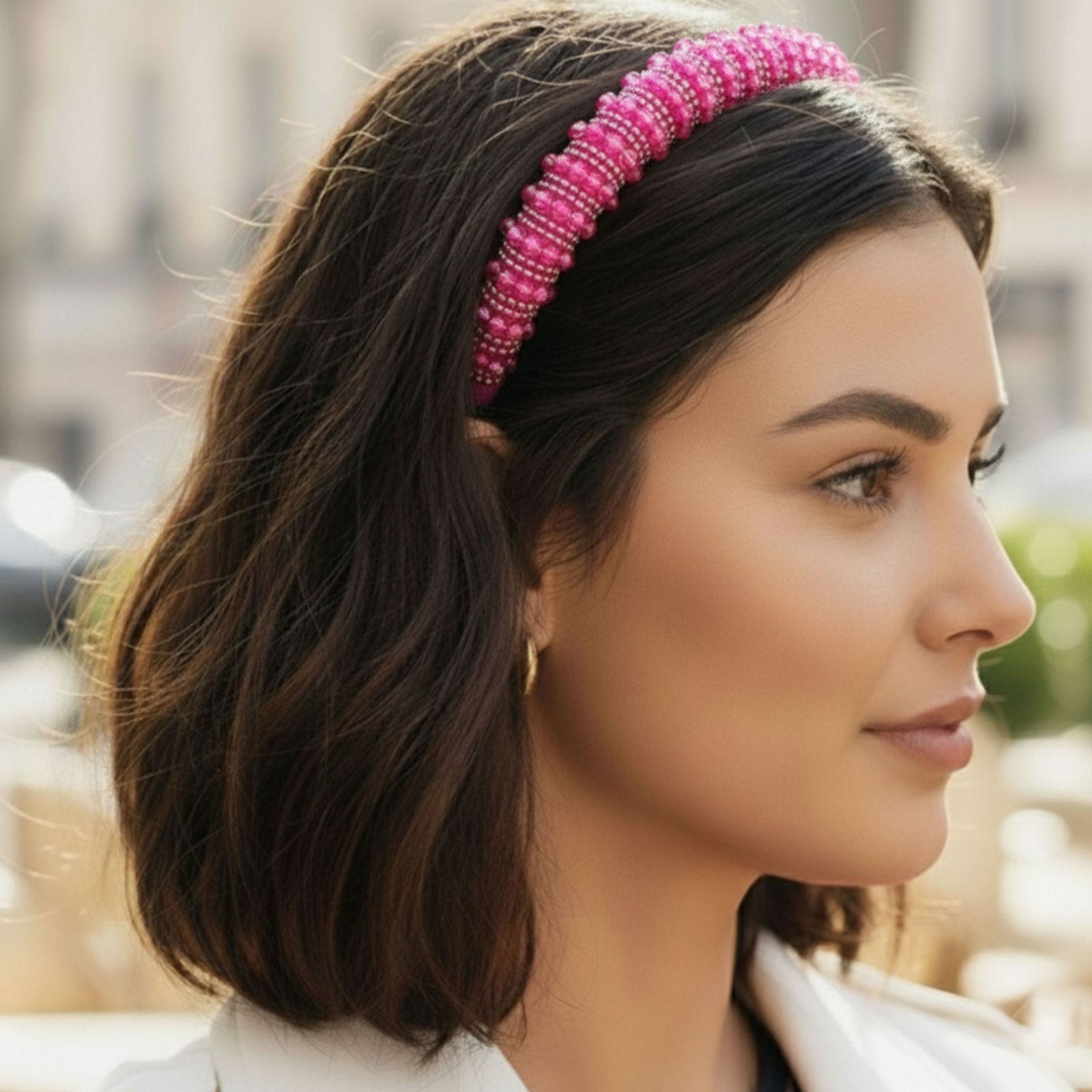 Osez la couleur avec le serre-tête fuchsia en perles décoratives. Son éclat vif et lumineux apporte une touche de caractère à vos coiffures tout en restant chic et élégant.