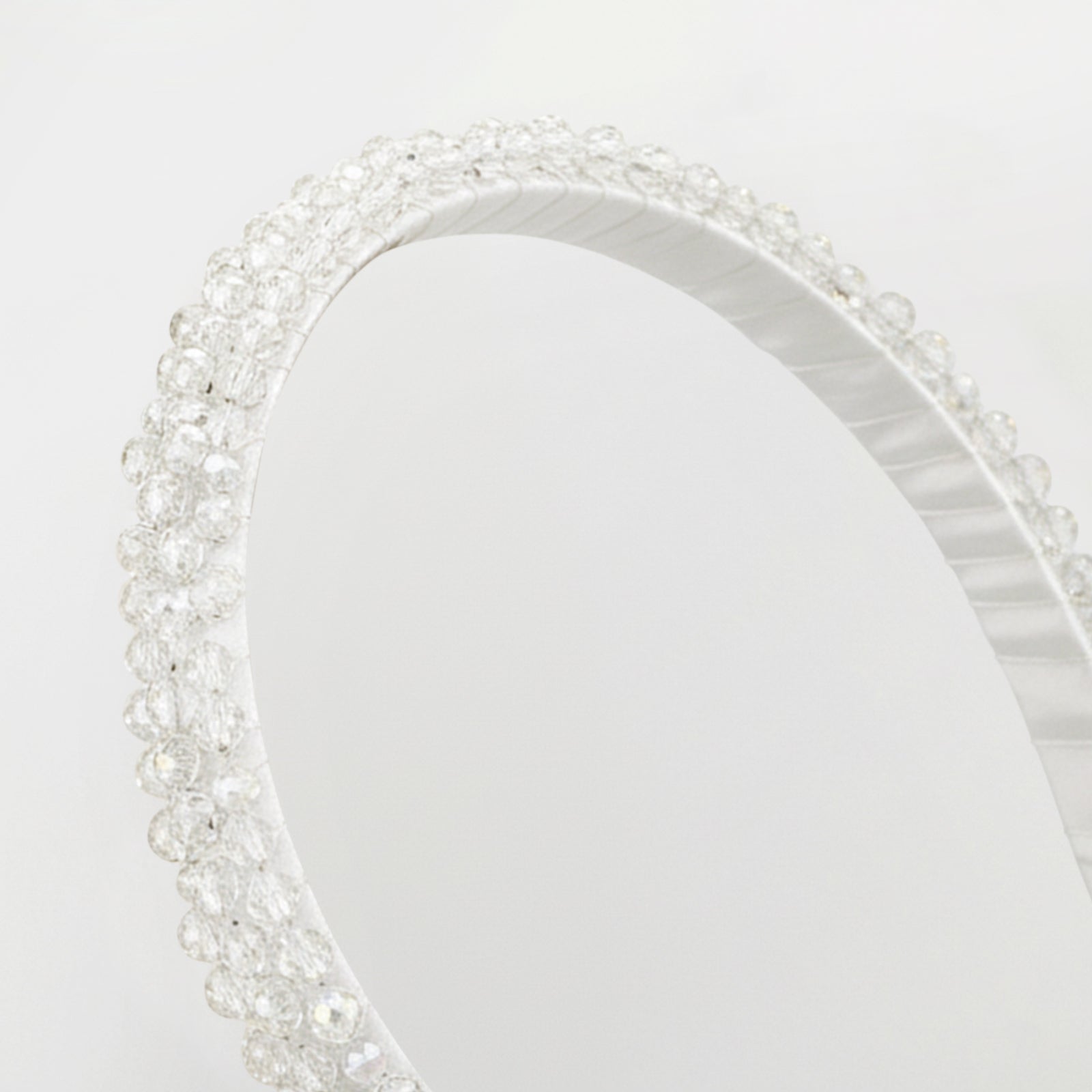 Sa base satinée blanche et ses finitions soignées en font un accessoire raffiné, idéal pour sublimer une tenue de mariée, un événement chic ou simplement apporter une touche lumineuse à votre style.