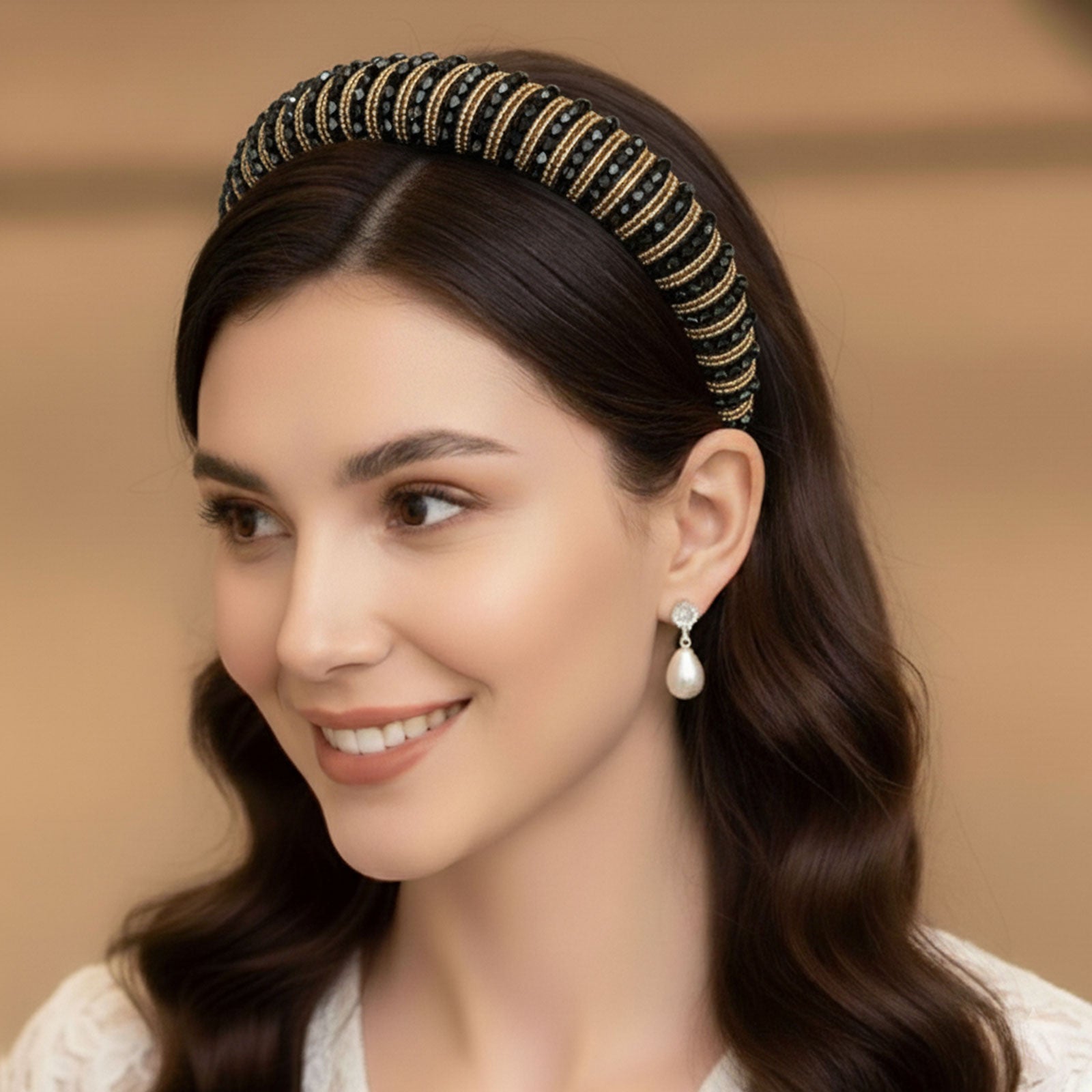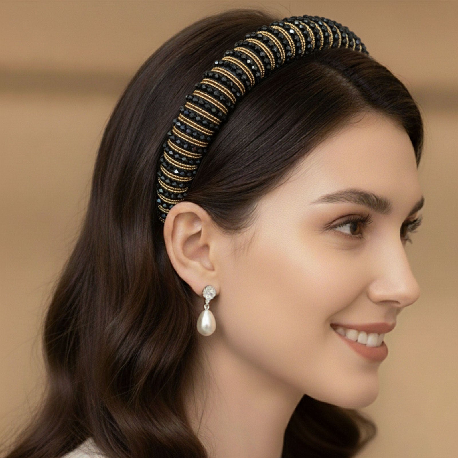 Affirmez votre style avec le serre-tête large noir & doré en perles facettées. Ses perles noires scintillantes contrastent élégamment avec les détails dorés pour un rendu sophistiqué et tendance.