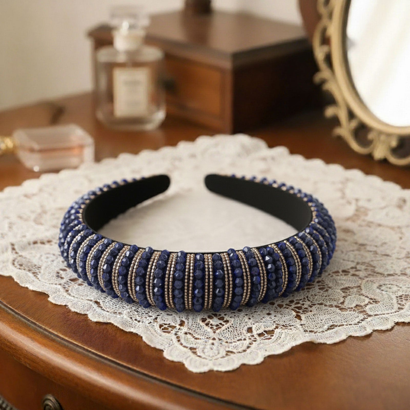 Brillez avec élégance grâce au Serre-tête Large Angie Blue Spark. Ses cristaux bleu nuit subtilement facettés, associés à de délicates finitions dorées, offrent un contraste raffiné et lumineux.