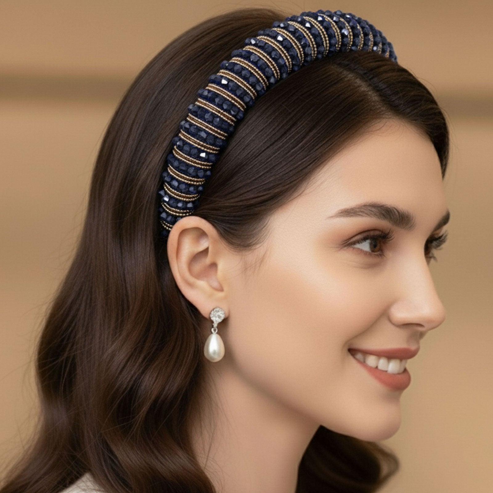 Matière : Base en tissu doux, ornée de perles facettées et de séparateurs métalliques raffinés