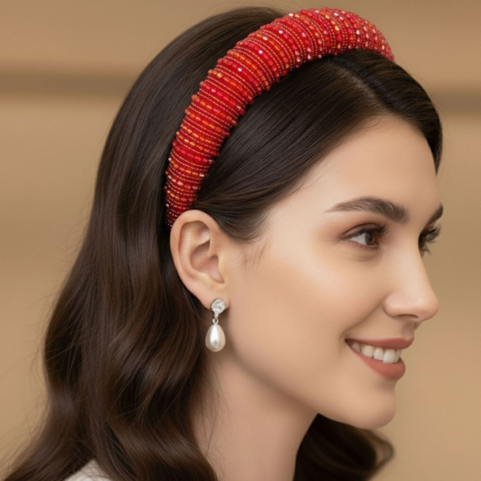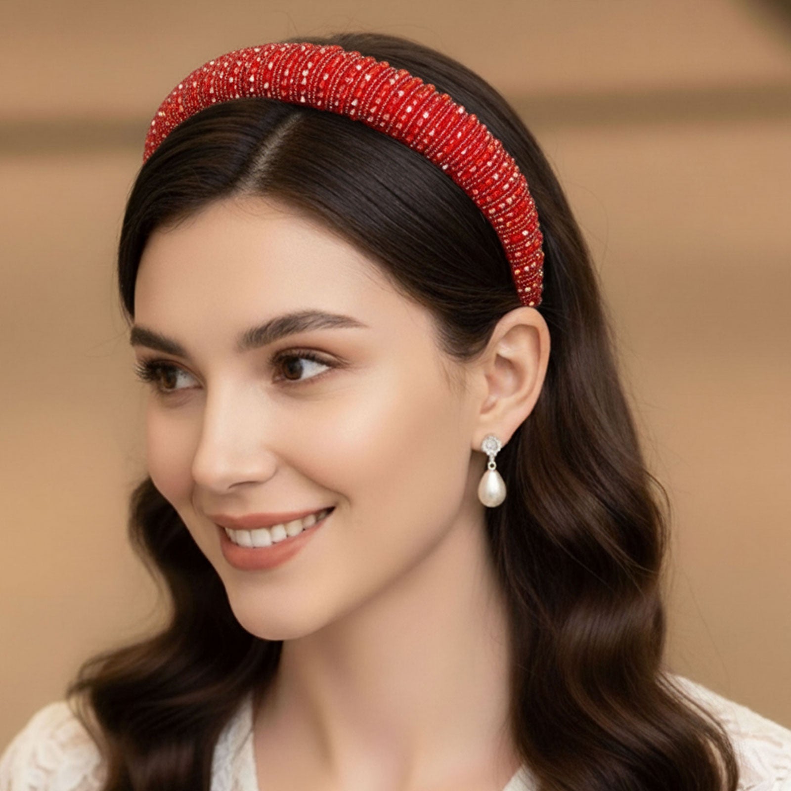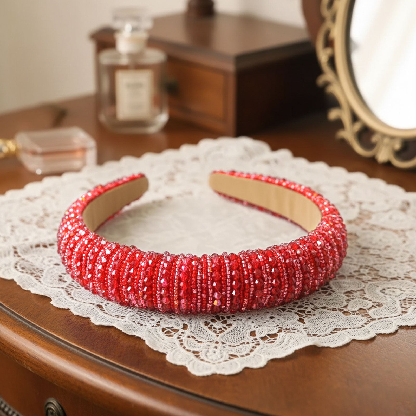 Matière : Base en tissu doux, ornée de perles facettées et de séparateurs métalliques raffinés