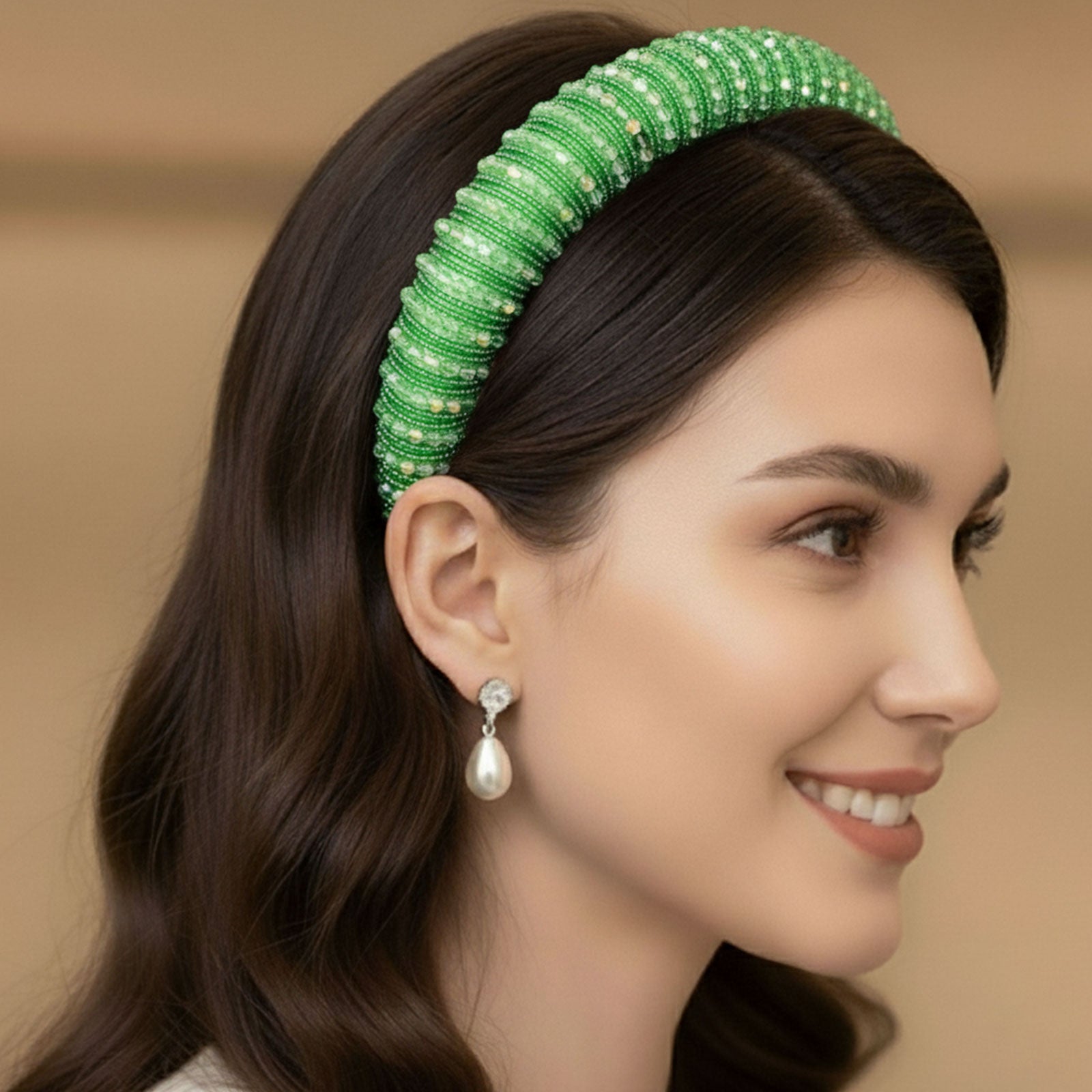 Matière : Base en tissu doux, ornée de perles facettées et de séparateurs métalliques raffinés