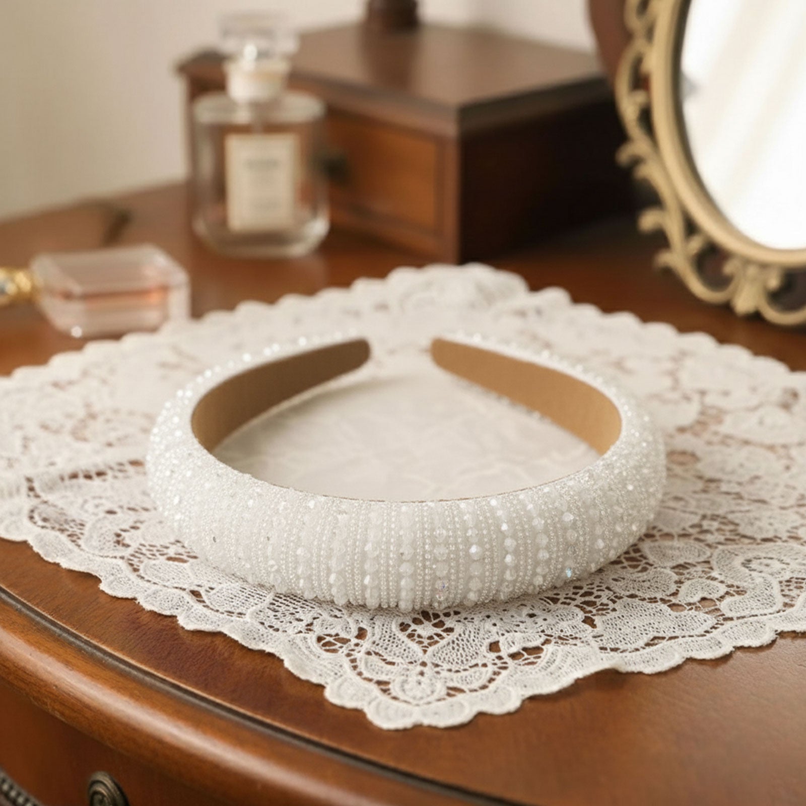 Matière : Base en tissu doux, ornée de perles facettées et de séparateurs métalliques raffinés